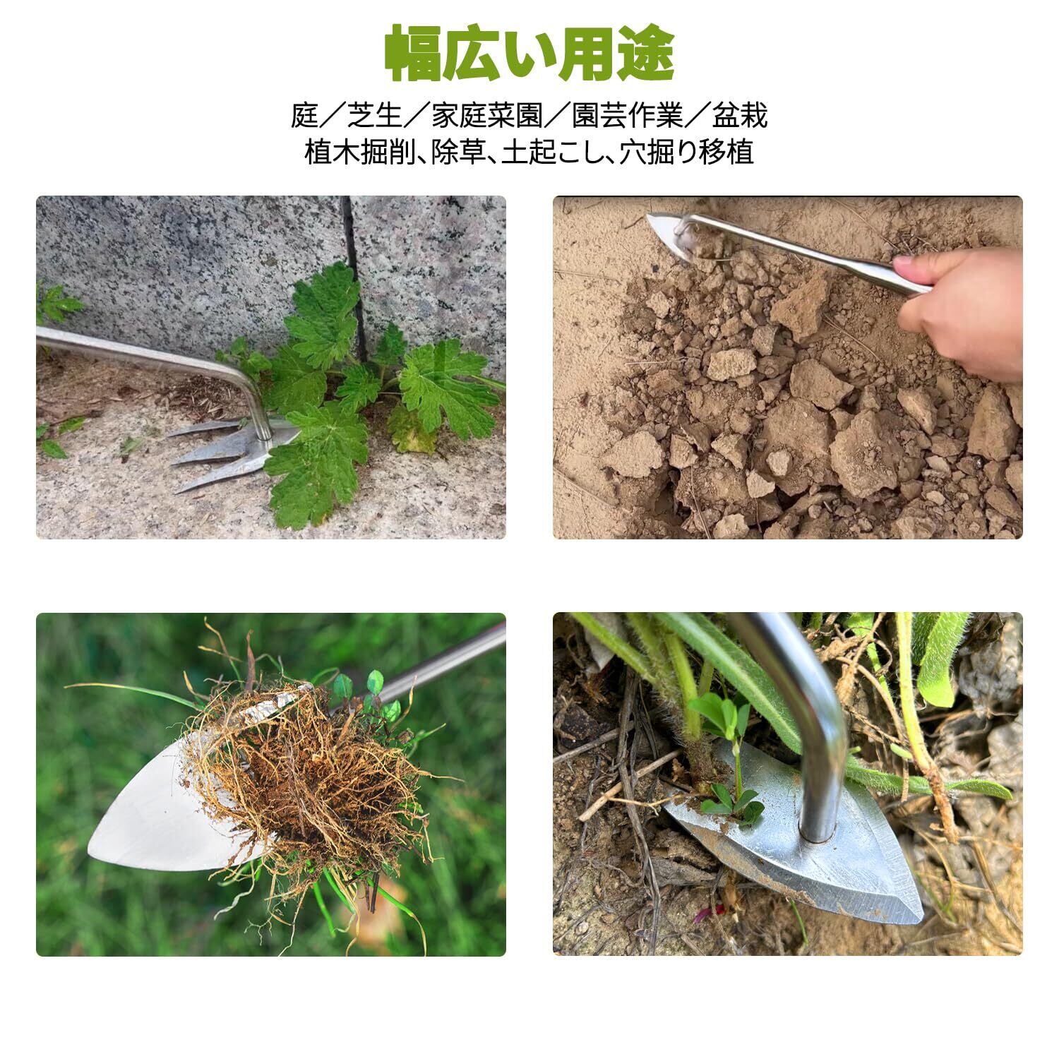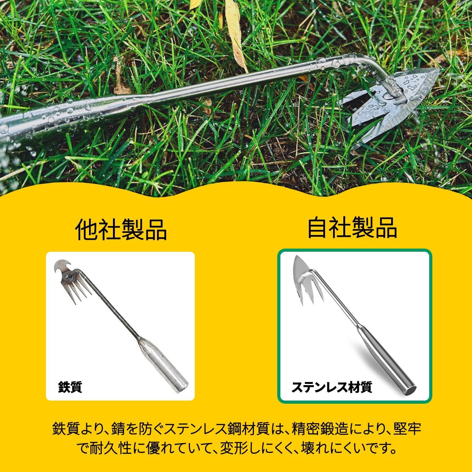 【優れたステンレス素材】草取り道具は高品質のステンレス鋼製で、鋭利で耐摩耗性に優れ、硬度が高く、耐衝撃性と引張強度が高く、激しい作業でも部品が脱落することはない。清掃しやすいように研磨され、耐久性のために精密鍛造されている