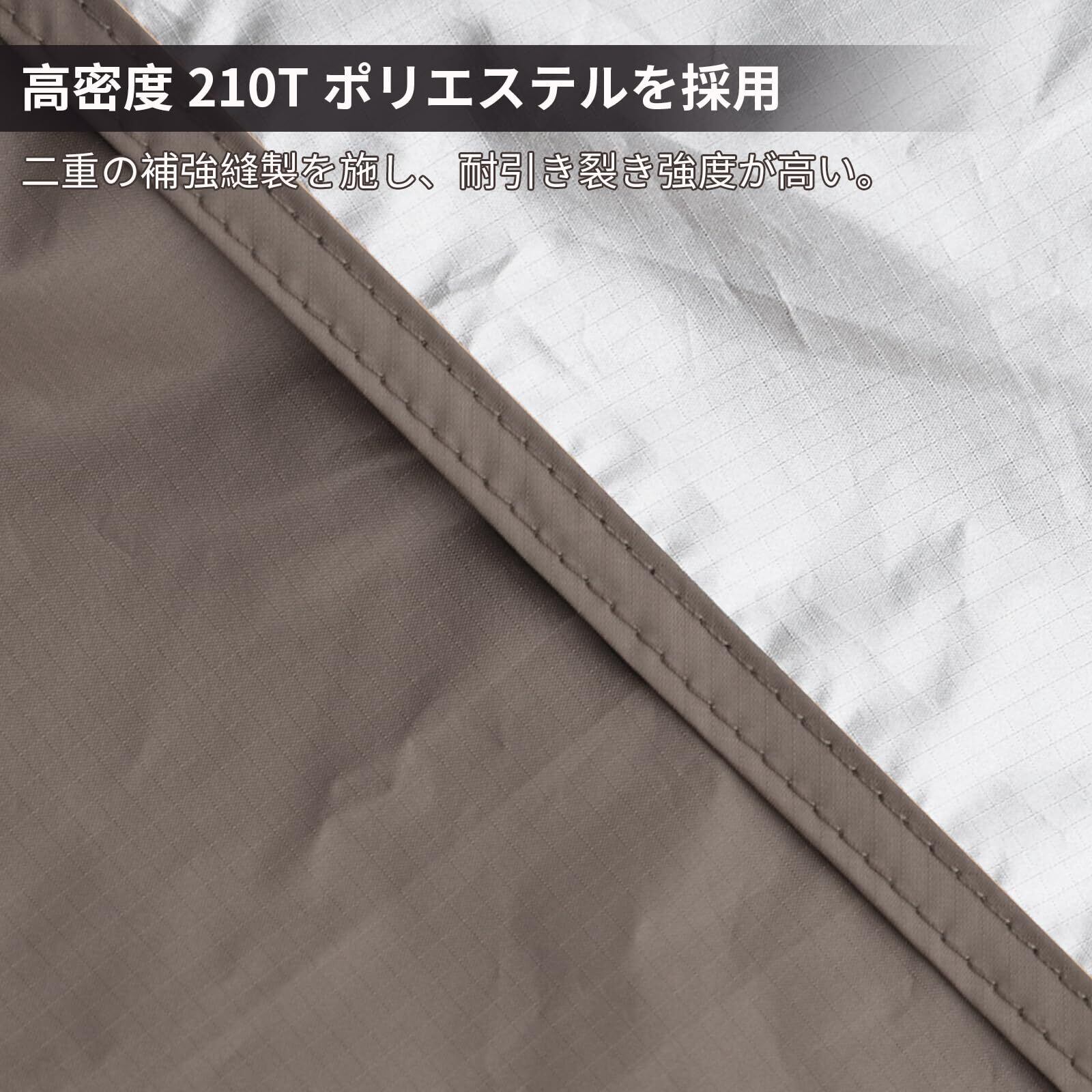【優れた耐久性&耐引裂性】厚みのある210Tポリエステルを採用して、強い耐引裂性を持ちます。摩耗や破れを防ぐことができます。通常のタープより厚手、耐摩耗性と遮熱性UP。タープの縁が破れないように、縁を二重に補強したステッチを施しています。
