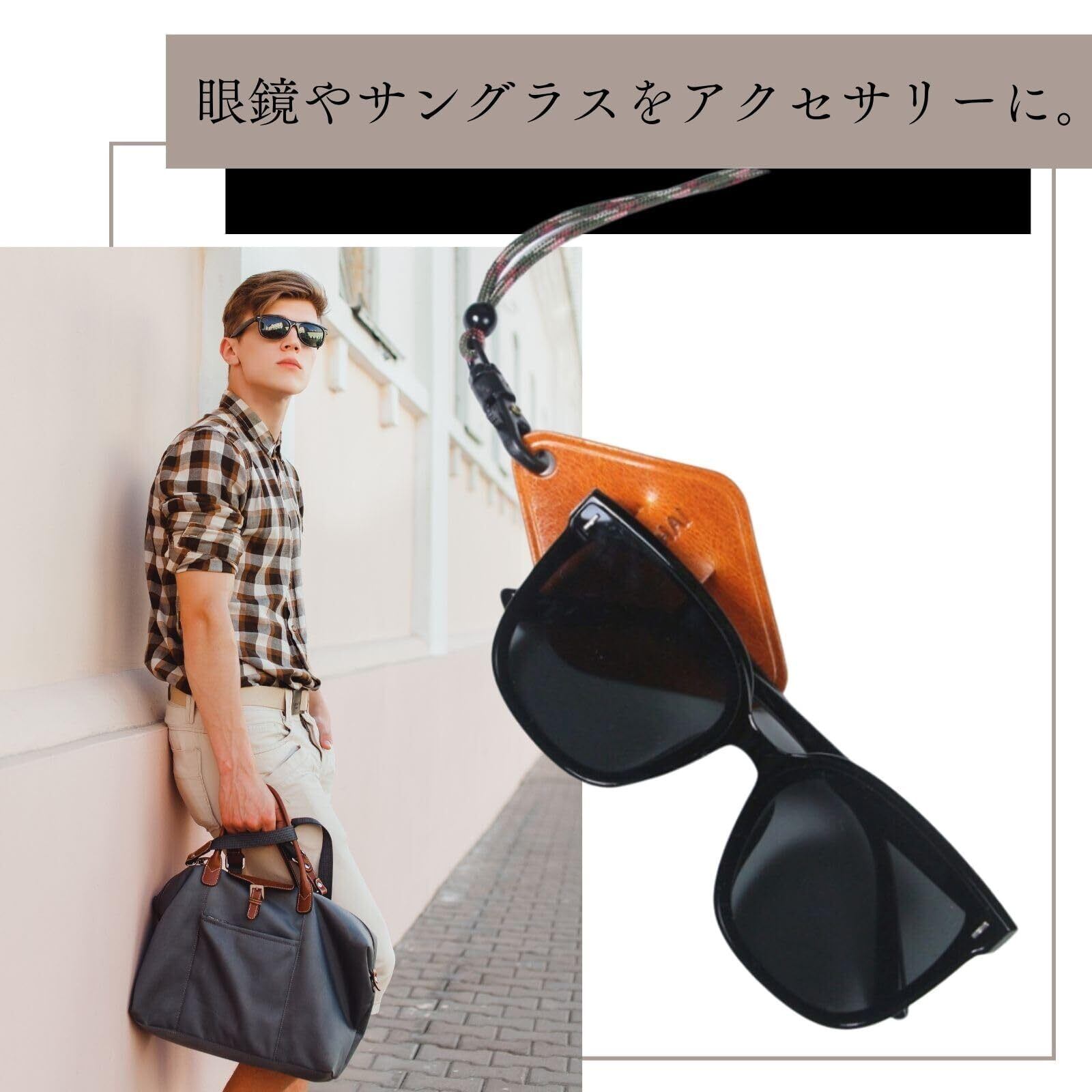 オシャレで便利なメガネホルダーネックレスです!本革素材のトップで落ち着いた印象のネックレスです。