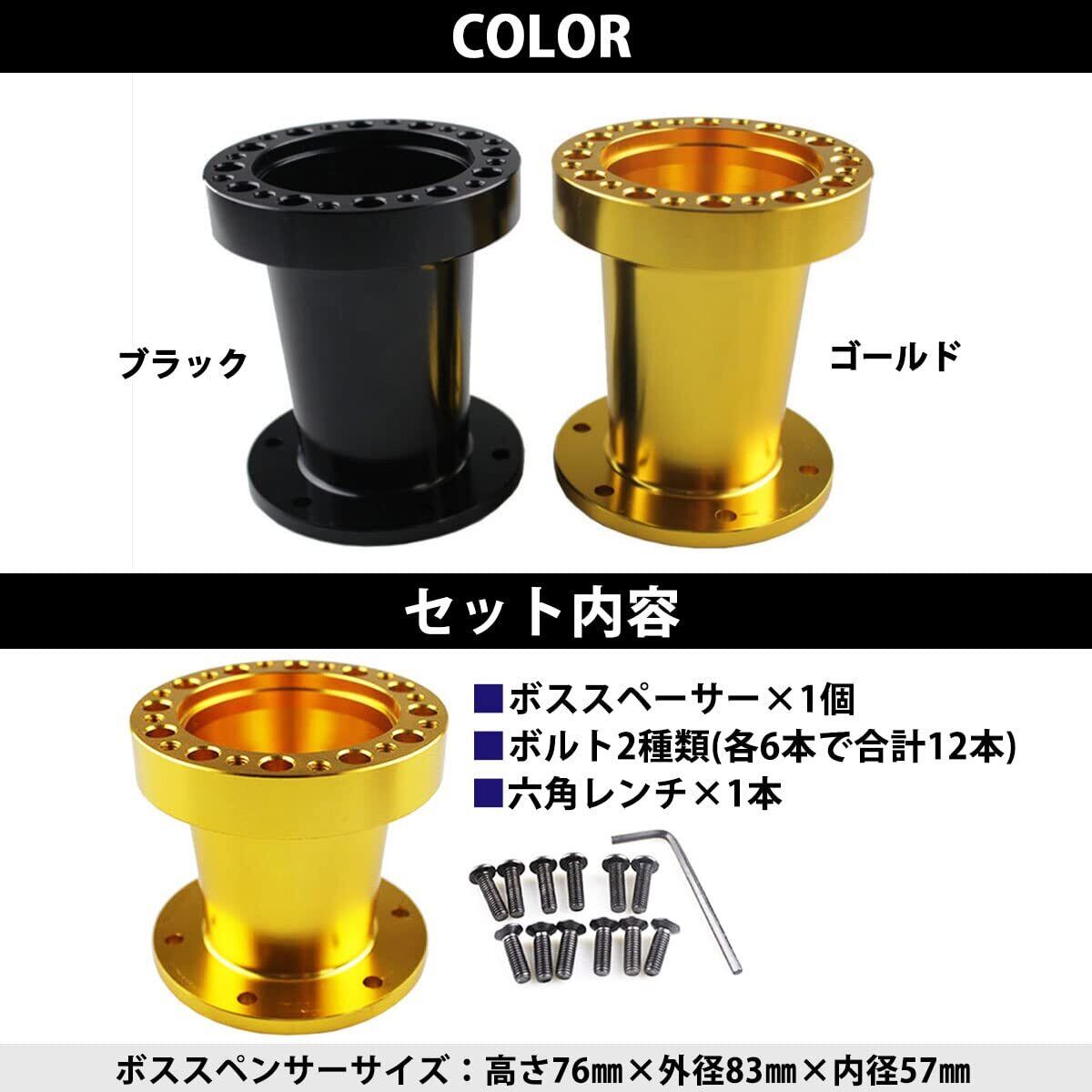 【仕様】セット内容:ボススペーサー×1個、ボルト2種類(各6本で合計12本)、六角レンチ×1本。サイズ:ボススペーサー:高さ76㎜×外径83㎜×内径57㎜。カラー:ブラック。