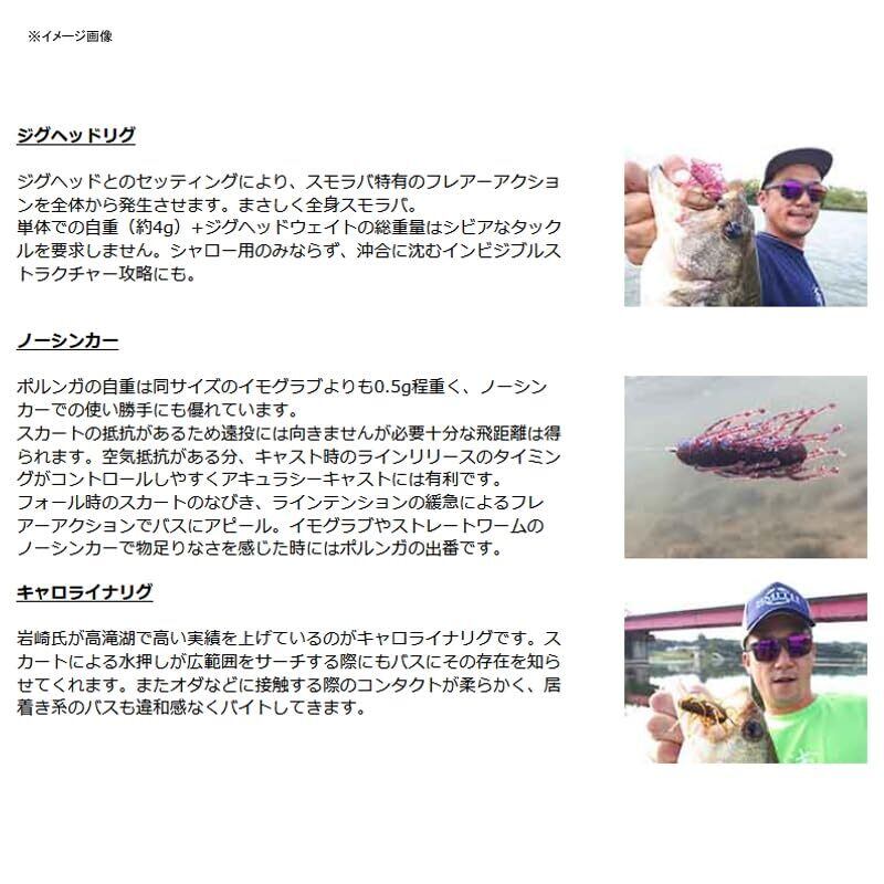 やや後方重心のコアボディに、水流にたなびくやや長めのスカートを全身にまとった独特のフォルム。全身を包み込んだスカート効果で、ジグヘッドをセットすれば「ソフトなスモラバ」に。オフセットフック装着時は「スナッグレス効果」がプラスオン。フッキング率をアップを求めたソフトマテリアルで仕上げました。千葉県高滝湖を中心に活動中の岩崎秀治氏が生んだ変幻自在のソフトベイト。