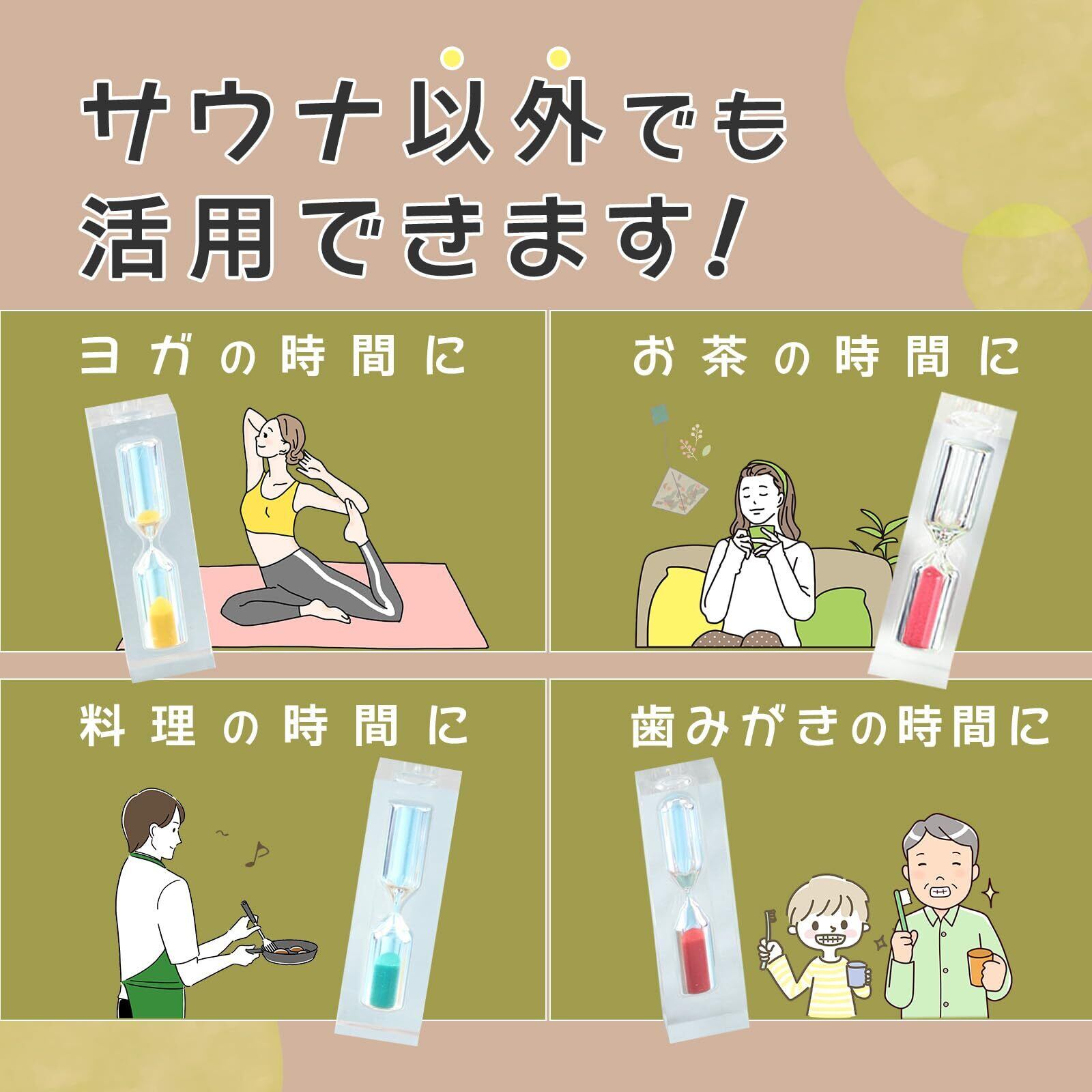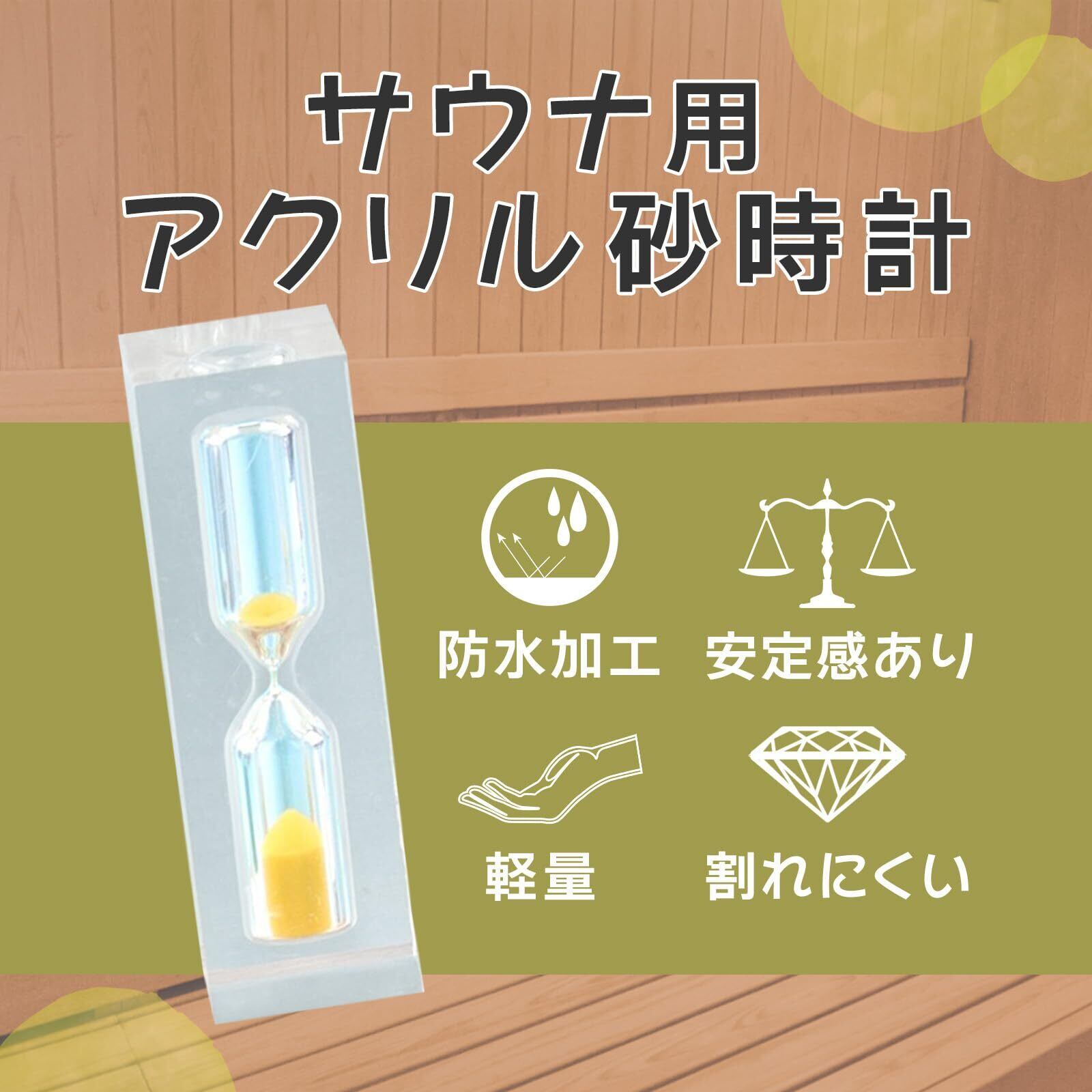 防水性と耐熱性を備えたアクリル砂時計です。サウナだけでなく料理のタイマーや水風呂、デスク上のタイマーとしてもお使いいただける多用途アイテムです。サウナの温度や湿度にも耐えられる素材で作られているため、安心してサウナやキッチンなどの水周りでも使用可能。ギフトとしても喜ばれるミニサイズのインテリア砂時計で、時間管理をおしゃれにサポートします。 ※必ず水平な場所に設置してご使用ください。傾斜のある場所では正常に砂が落ちない場合があります。 まれに個体差による不具合が発生する可能性がありますが、その場合は交換対応いたします。