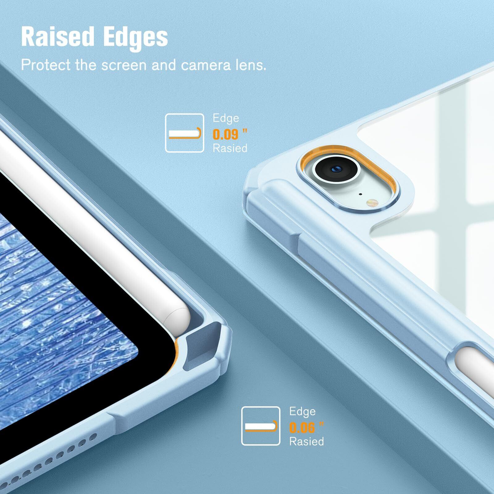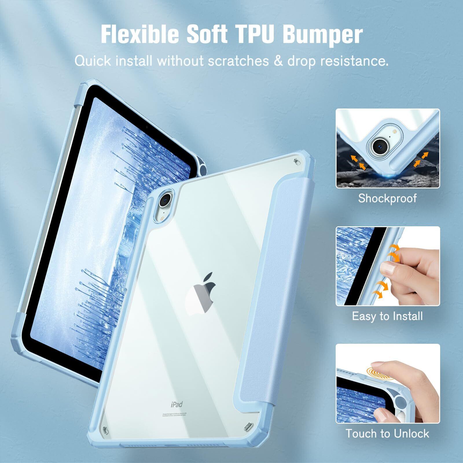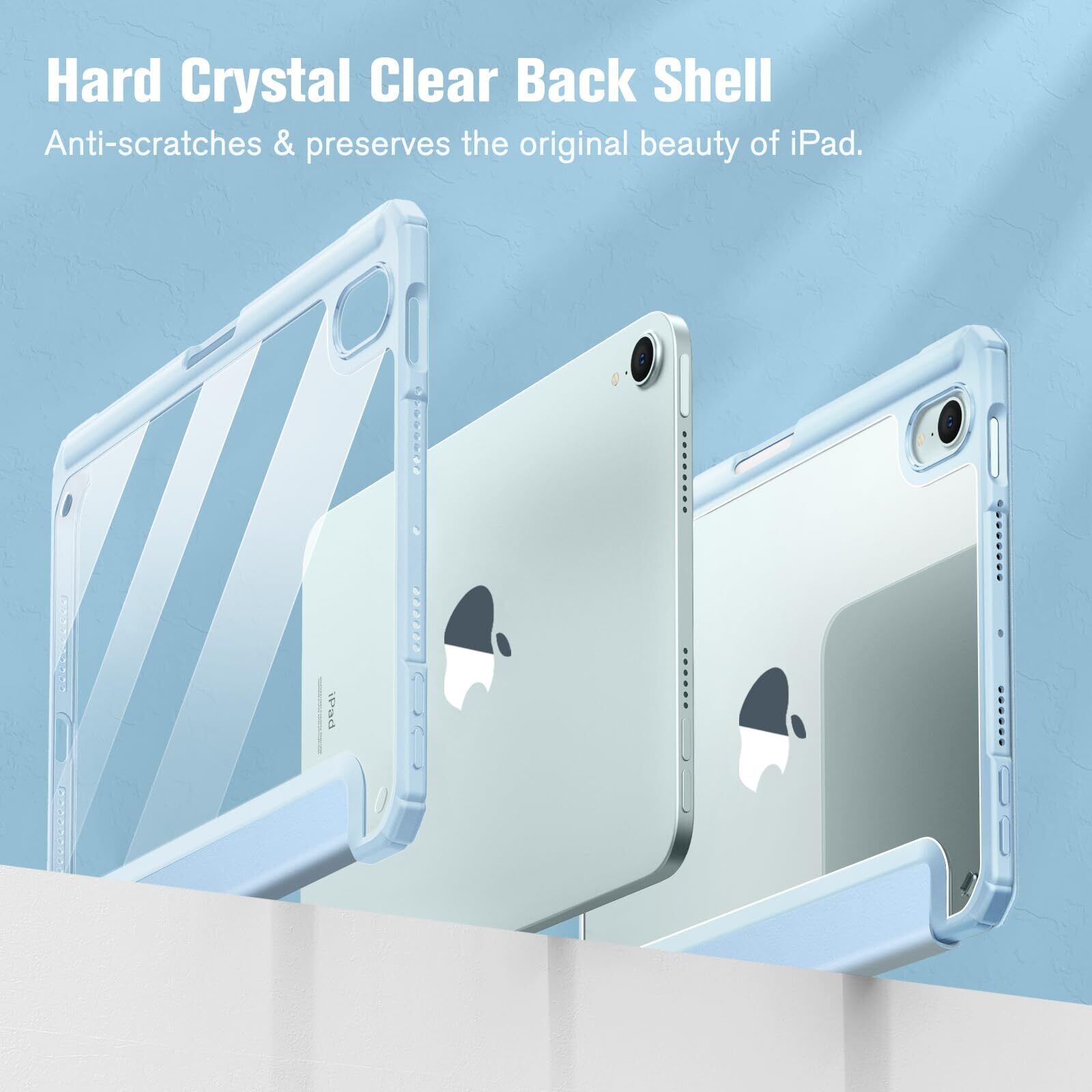 【材料・透明バックカバー】 ケースの表面はPUレザー素材を利用して、軽量、超薄を備えます。ポリカーボネート素材を採用している透明バックカバーは汚れや傷つけなどを防止するだけでなく、iPad本体の色と美しさも活かせます。透明バックカバーの枠は柔軟なTPUを採用して、取り付けも簡単にできます。フロントカバー内部材質はマイクロファイバーで、摩擦によって発生する傷を抑え、液晶画面を保護しきれいに保ちます。(ご注意:透明バックカバーには保護用のフィルムがついていますので、ご使用前に保護フィルムを剥がしてください。)