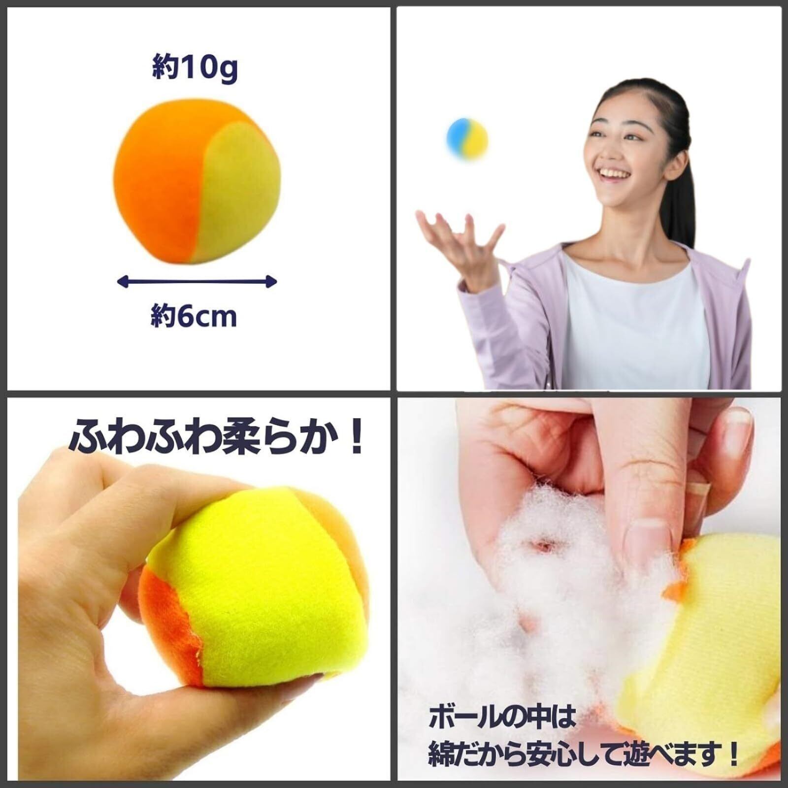 セット内容:布製ボール10個入り 大きさ:直径約6cm 重さ:10g 対象年齢6歳以上