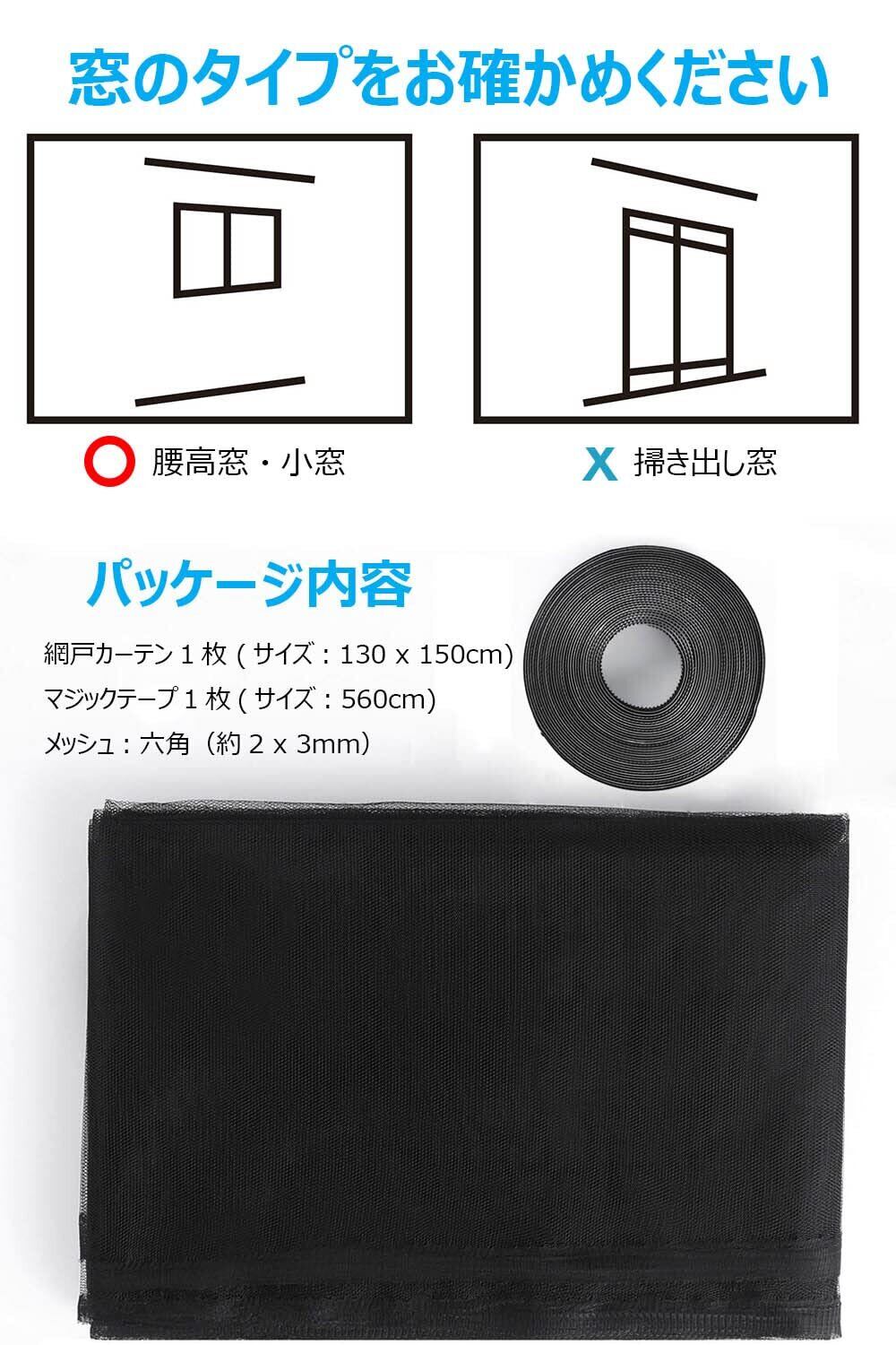 セット内容:防虫網1枚(130x150cm)+マジックテープ1枚(560cm)+取説。設置可能窓:腰高窓、小窓 。 設置不可窓:掃き出し窓。