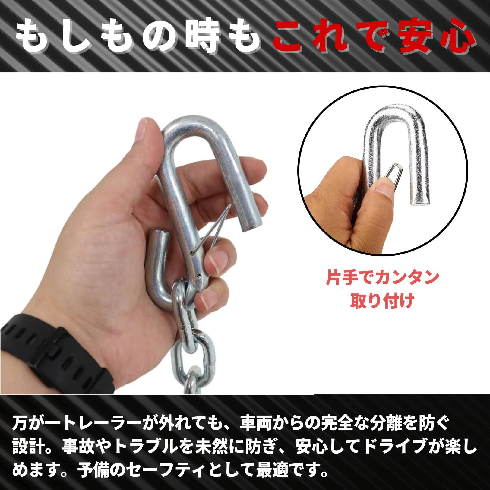 【簡単かつ安全な接続】 操作はとてもシンプル。2本のチェーンを使用し、カプラーの下で交差させ、ヒッチレシーバーの安全チェーンループにかけるだけです。約70センチの長さで十分な余裕があり、あらかじめ取り付けられたSフックにより、不意の外れを防止します。