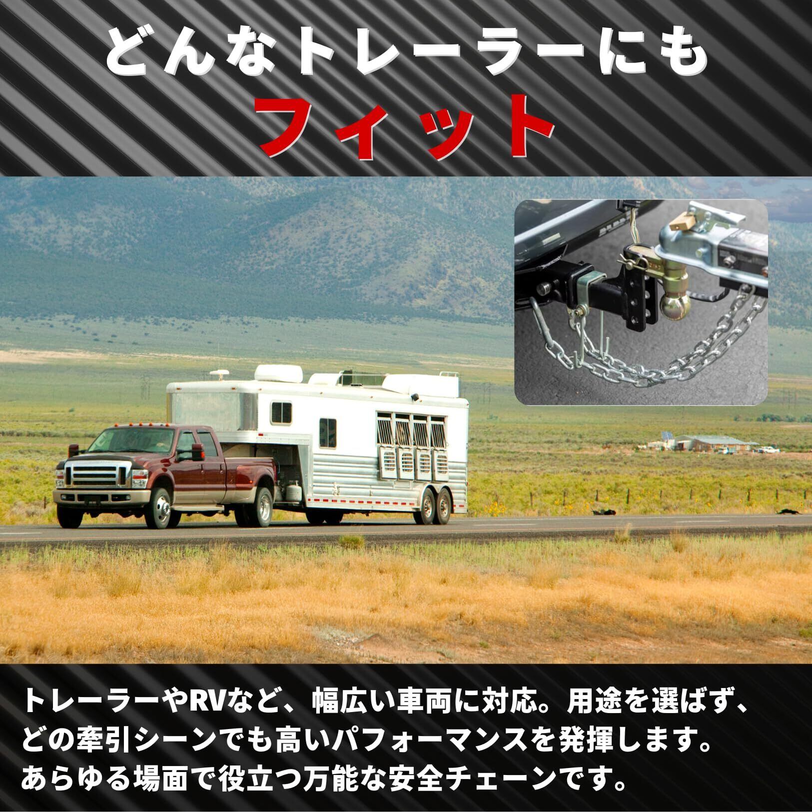 【多用途に対応】 この安全チェーンは、トレーラーやRVなど、あらゆる牽引用途で使用可能です。輸送中にトレーラーがフックから外れた場合でも、トレーラーの完全な分離を防ぎ、追加の安全対策として機能します。