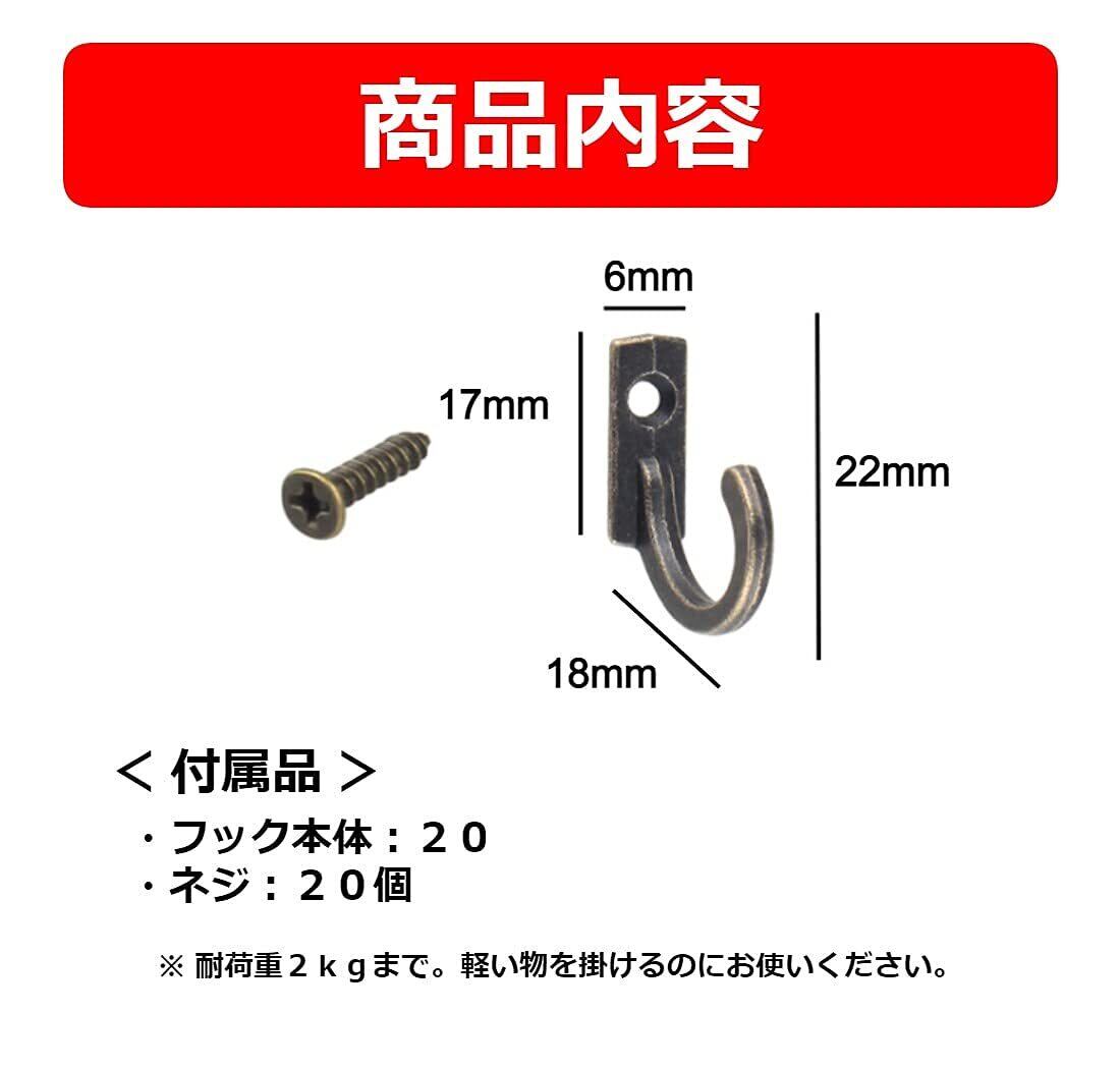 【商品内容】 フック20個 ネジ20個 耐荷重:約2kg 幅:約6mm 高さ:約22mm 奥行:約18mm