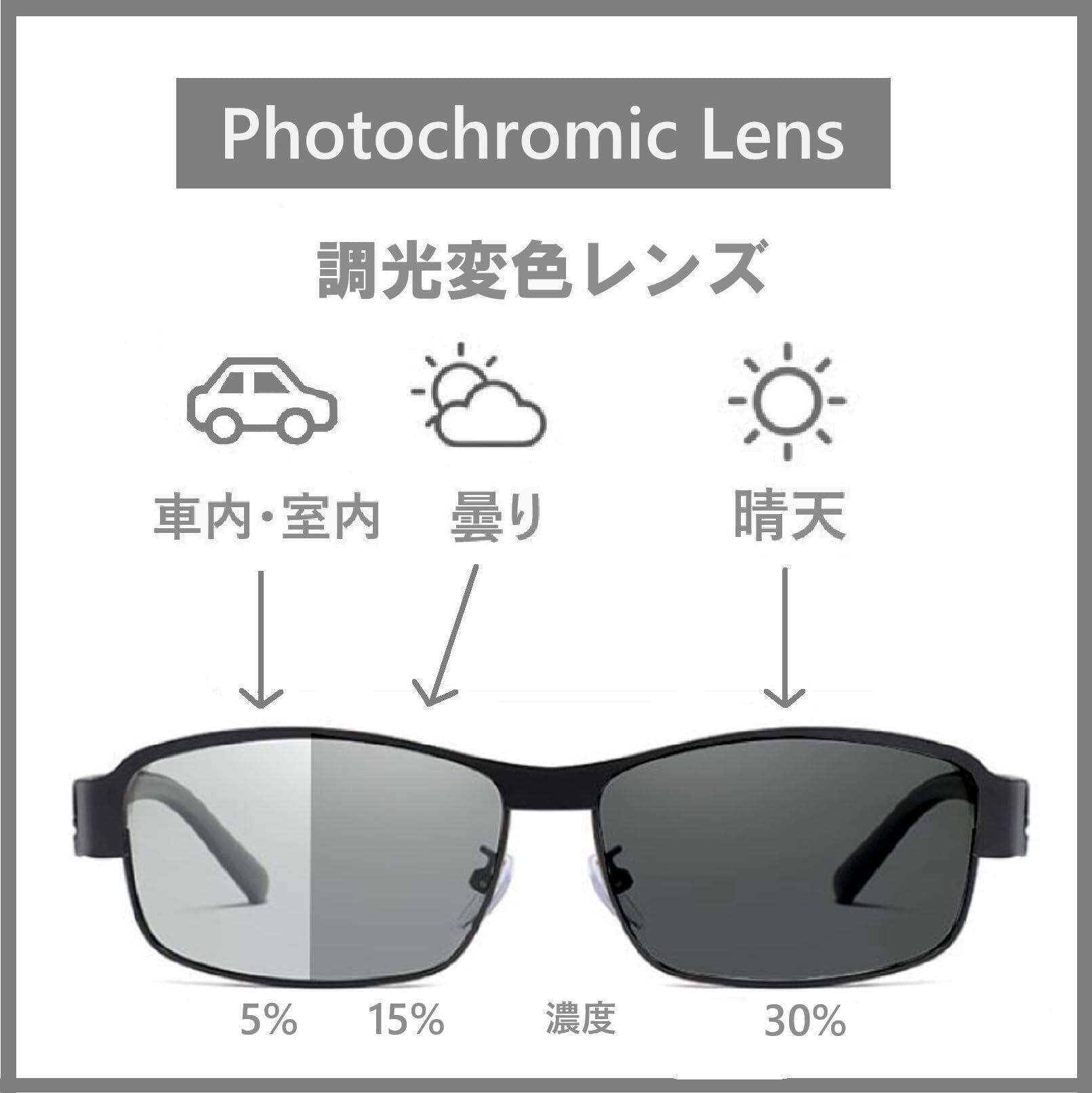 【偏光グレーレンズ+調光変色】当製品の「偏光グレーレンズ」の特徴は「偏光ブラック」と違い、ドライブ中の外の明るさの変化に対してオールマイティな視覚(トンネルでの付け外し不要・夜間でも効果を発揮)で、乱反射のないクリアな視界を確保します。また、 アウトドアでは太陽光を受けてレンズ濃度が30%まで自動変色しますので光の量を調節しながらUVフィルターにより有害な紫外線から目を守ります。