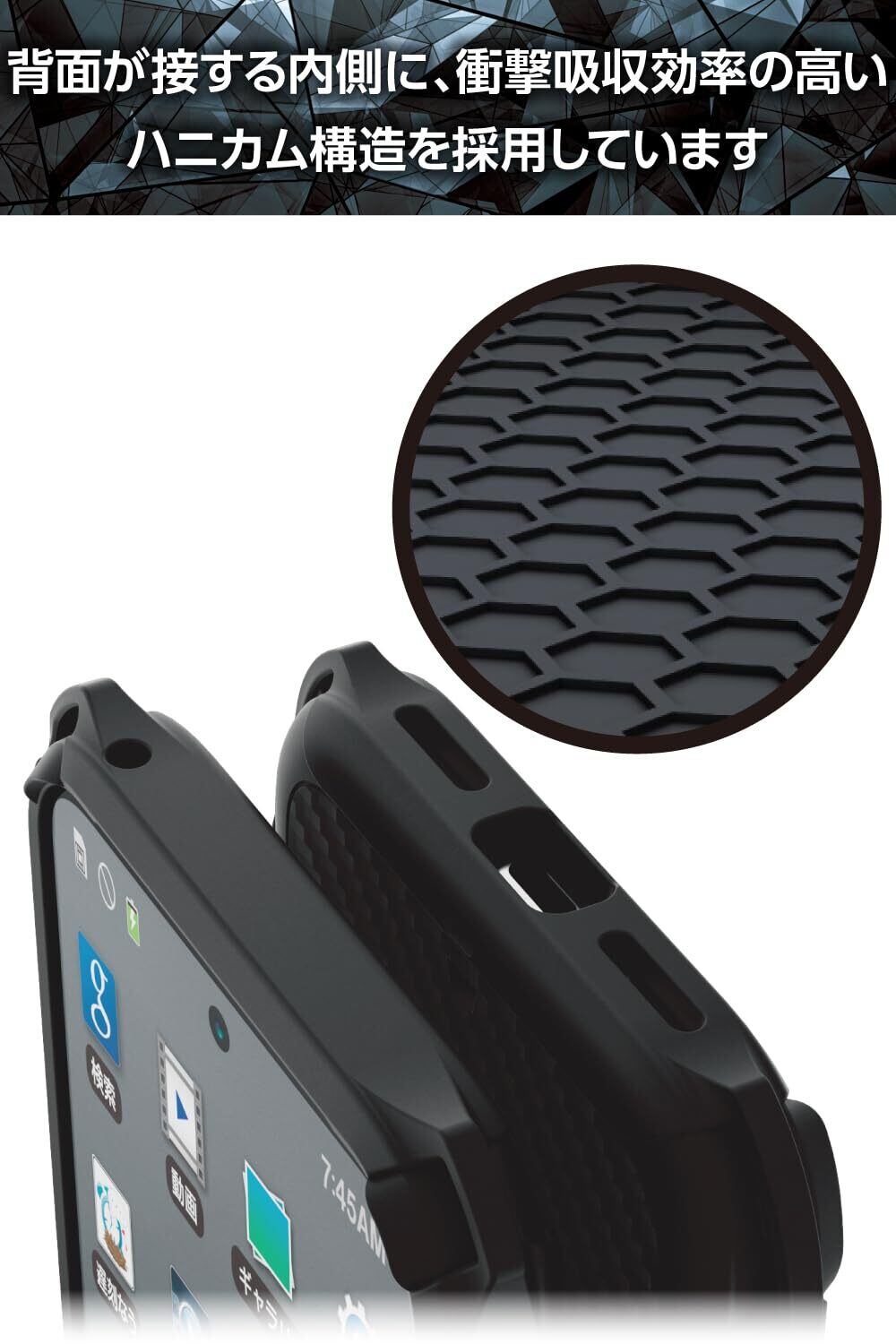 端末の背面が接するケース内側にも、衝撃吸収効率の高いハニカム構造を採用しています。
