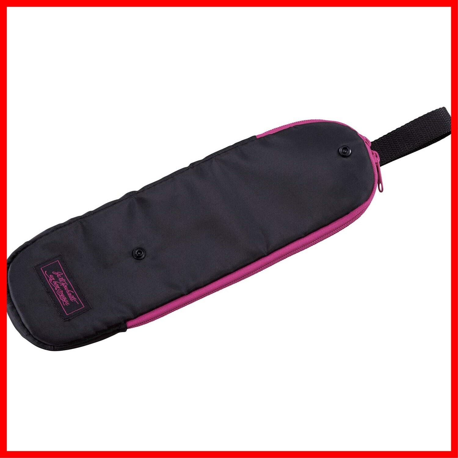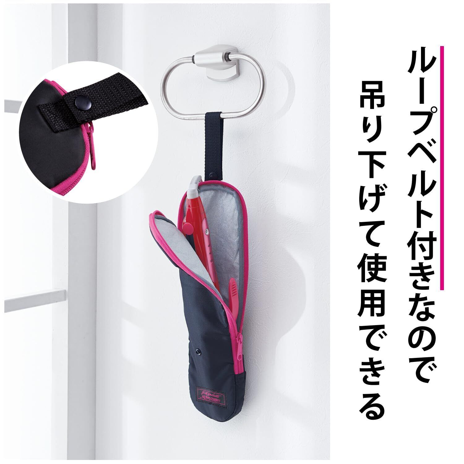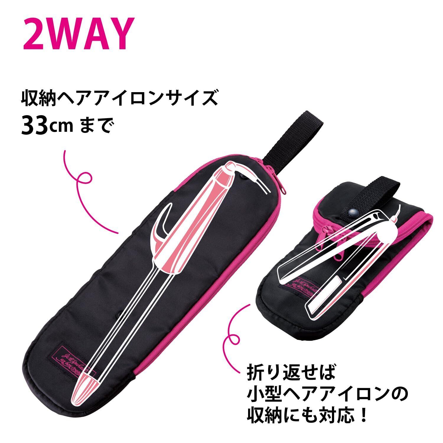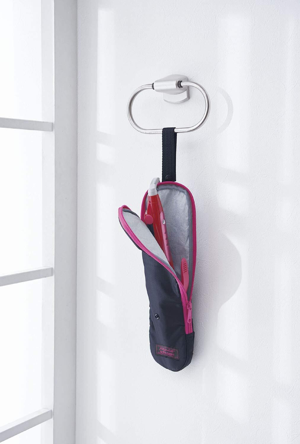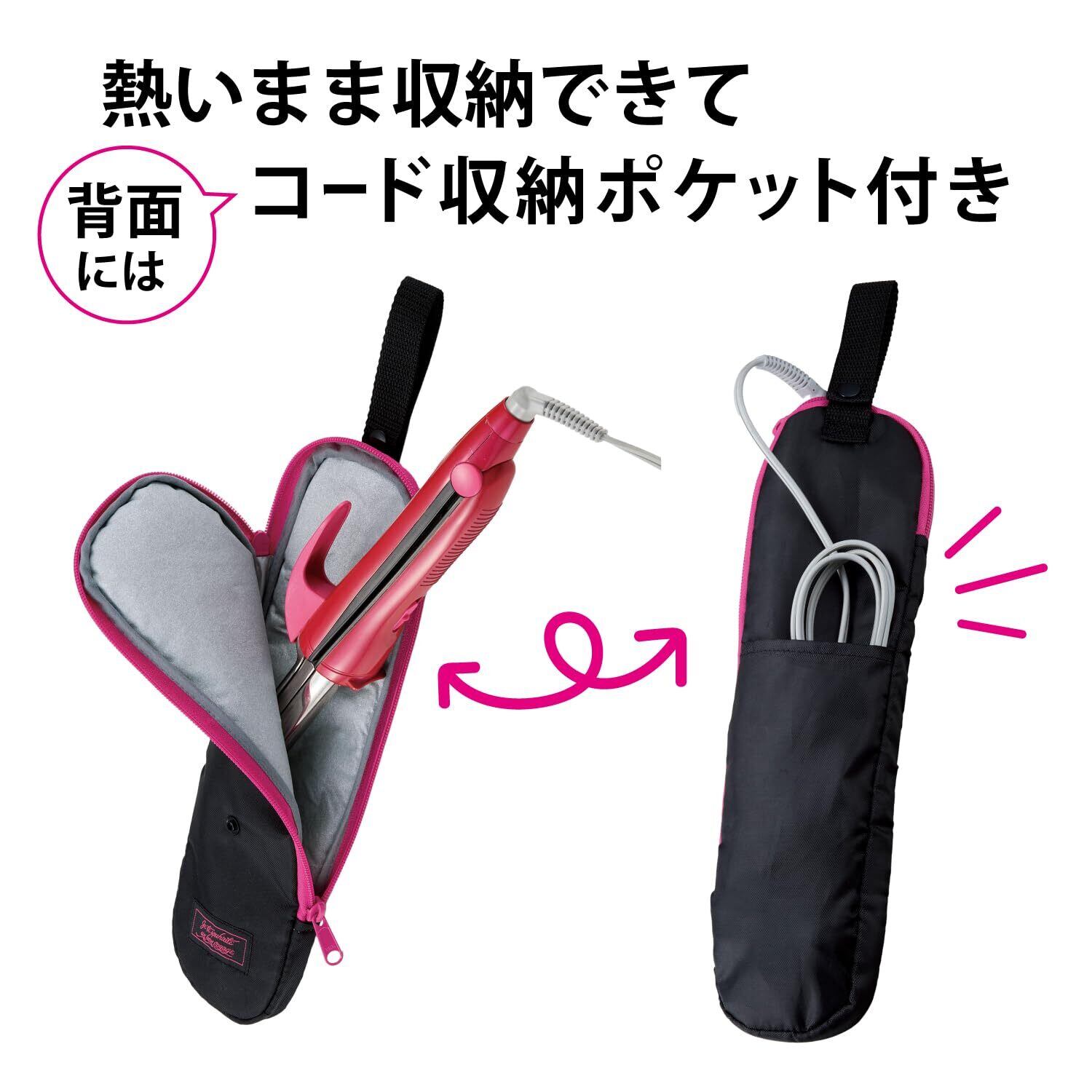 耐熱220℃。収納ヘアアイロンサイズ33cmまで。旅行に、忙しい朝に。 小型ヘアアイロンの収納にも。ループベルト付。 タオルバーやフックに吊り下げて使用可能。 内側に耐熱素材使用。220度まで耐熱可能。 収納ヘアアイロンサイズ33cmまで。 コードが収納できるポケット付。折り返せば小型ヘアアイロンの収納にも対応。