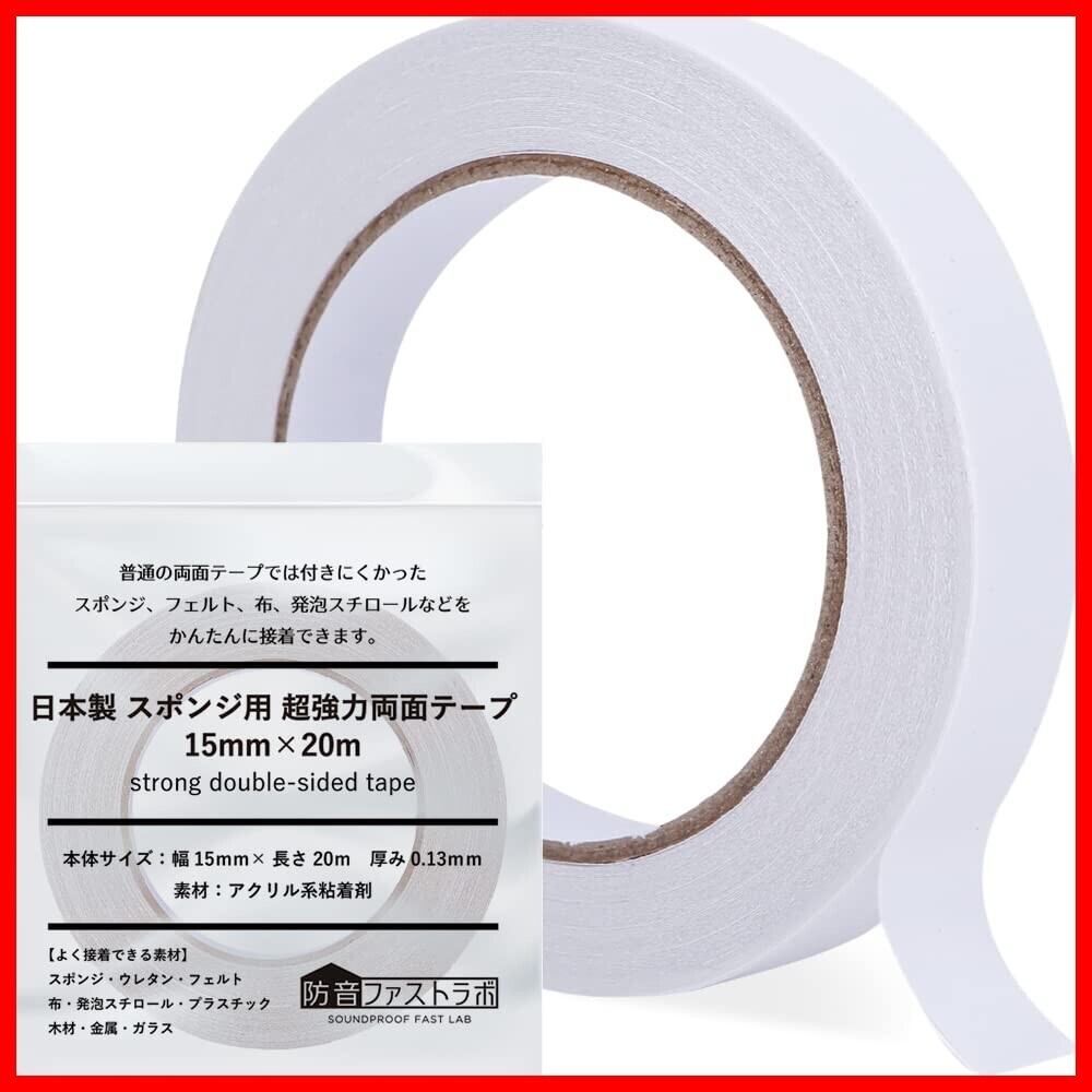 日本製【 接着しにくい素材に特化 】防音ファストラボ® スポンジ用 超強力両面テープ 15mm×20m 吸音材 緩衝材 ウレタン フェルト 布 発泡スチロール の貼り付けに