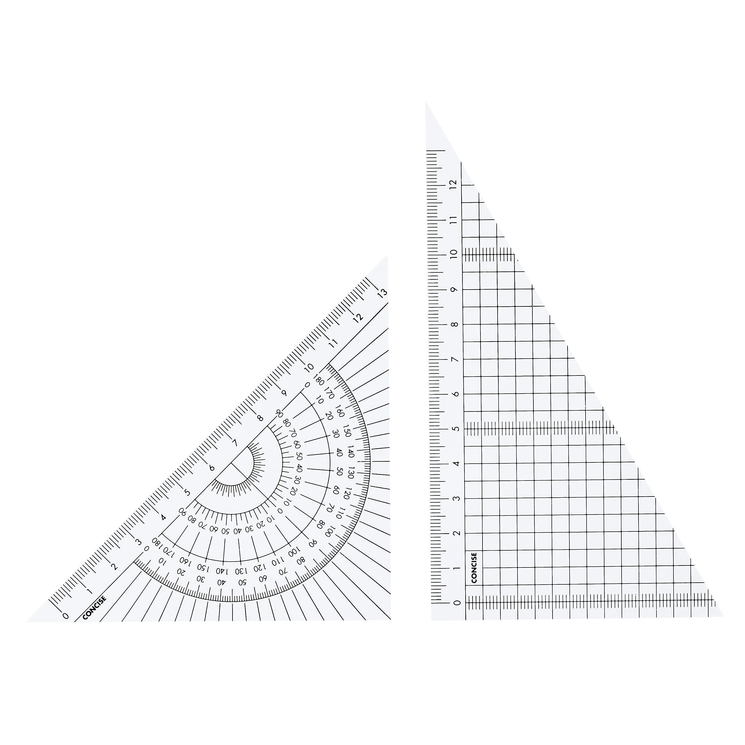 ◆45度三角定規には、180度までの分度器の目盛が入っているため通常の三角定規では測れない細かい角度まで測ることができます。(定規目盛は13cm) ◆60度三角定規には5mmの方眼目盛が入っているので、平行線・垂直線が取りやすく大変便利。(定規目盛は13cm)