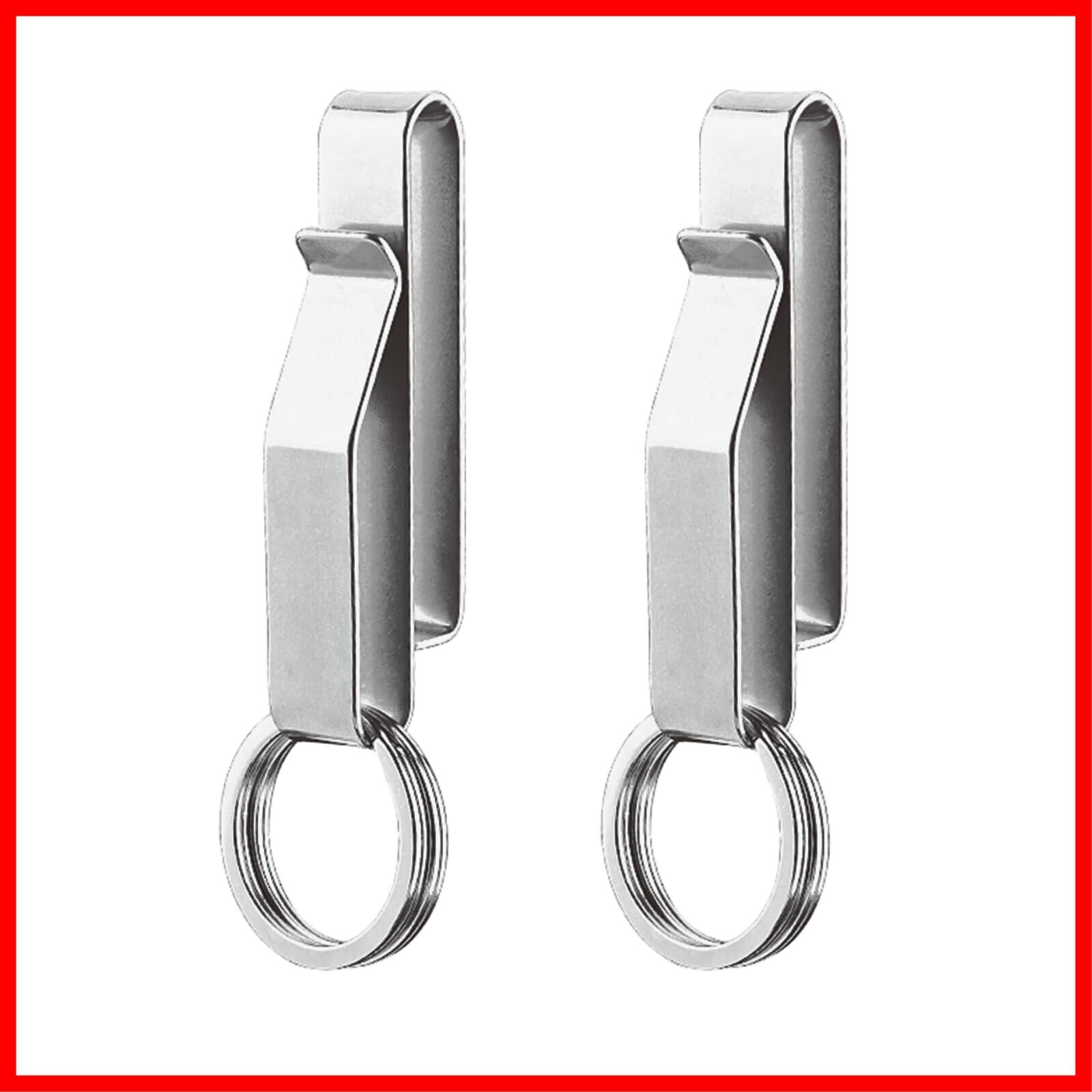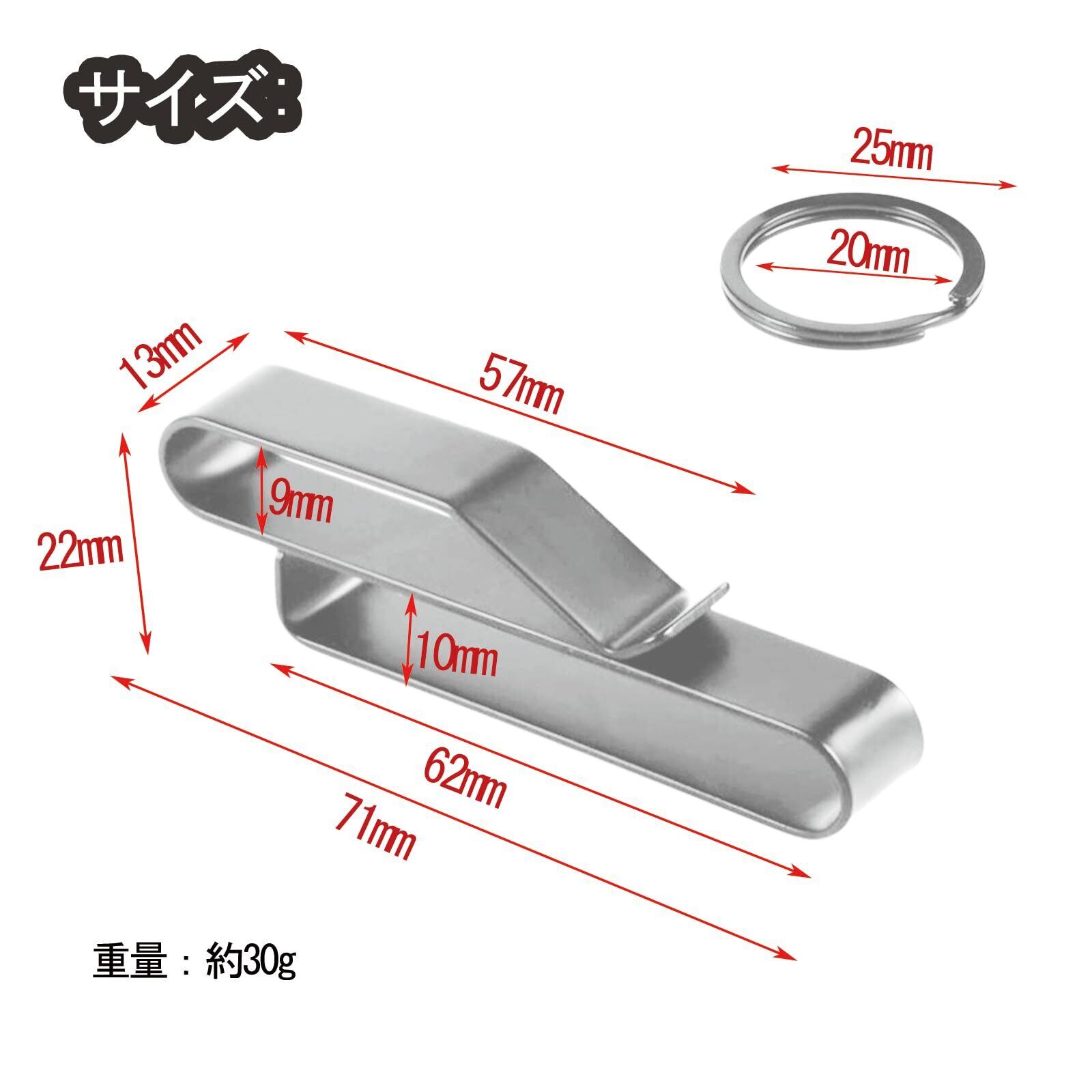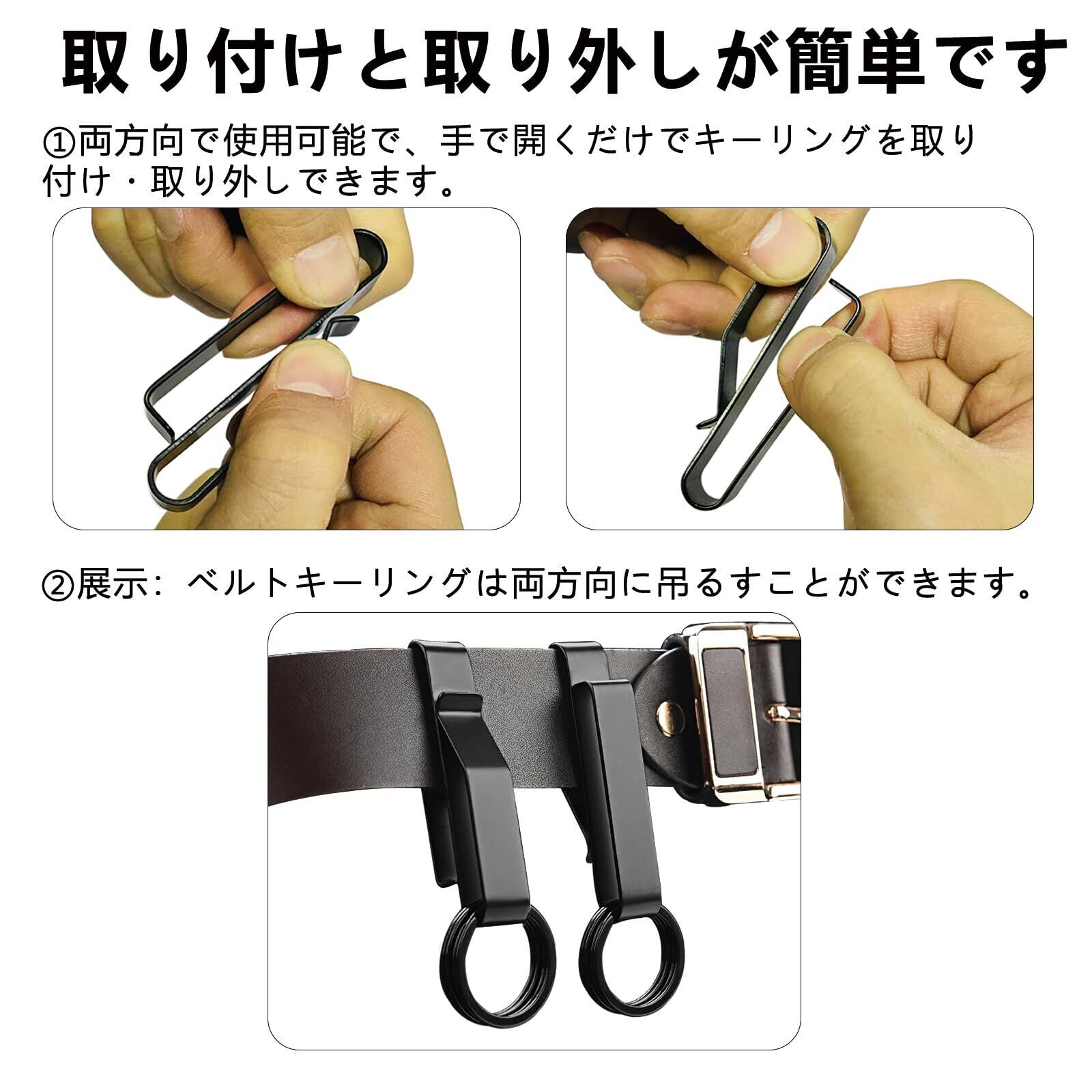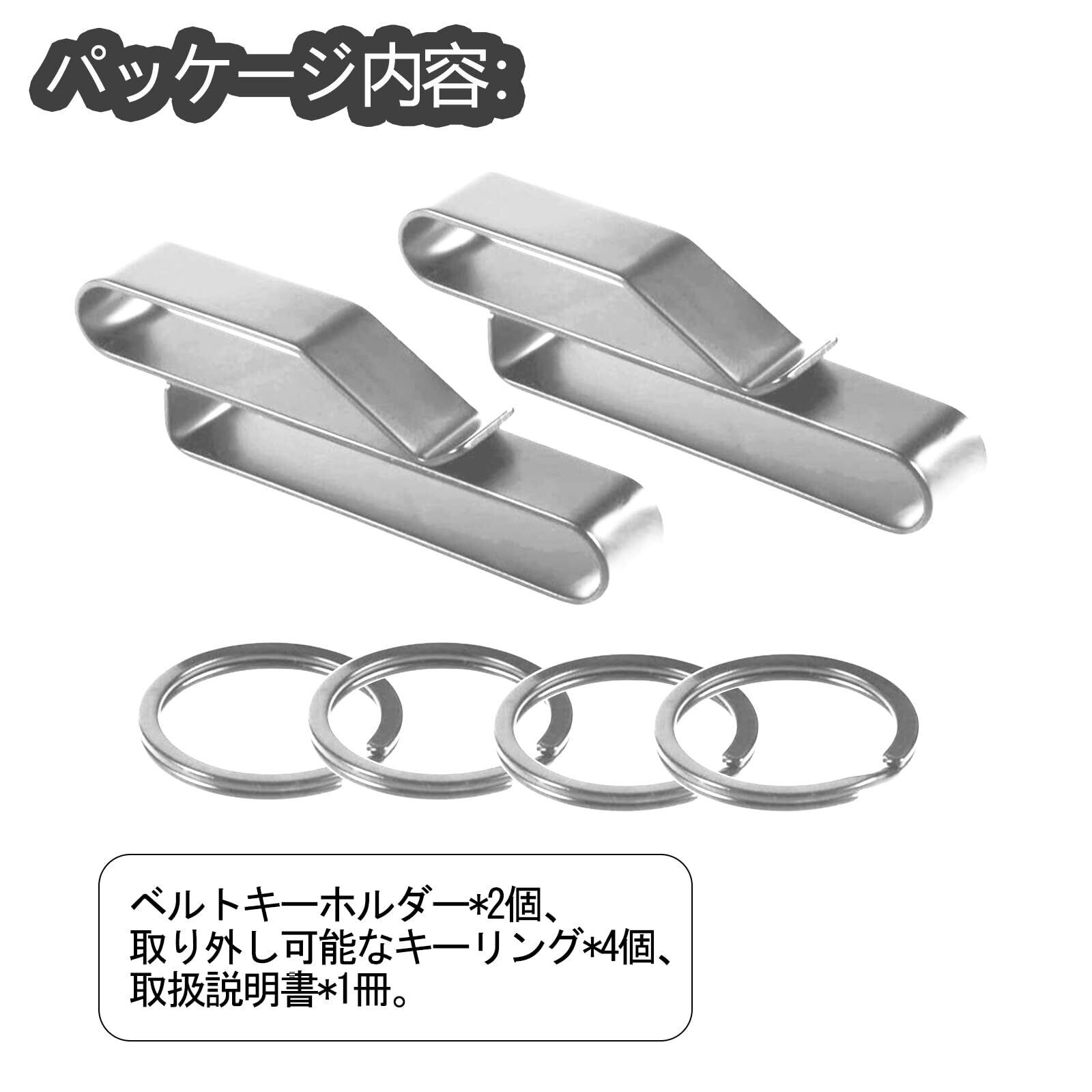 【商品情報】ベルトキーホルダー、素材:高炭素ステンレス鋼、カラー:シルバー、サイズ:7.1 x 1.3 x 2.2 cm、重量:約30g/セット、梱包内容:ベルトキーホルダー*2個、取り外し可能なキーリング*4個、取扱説明書*1冊。