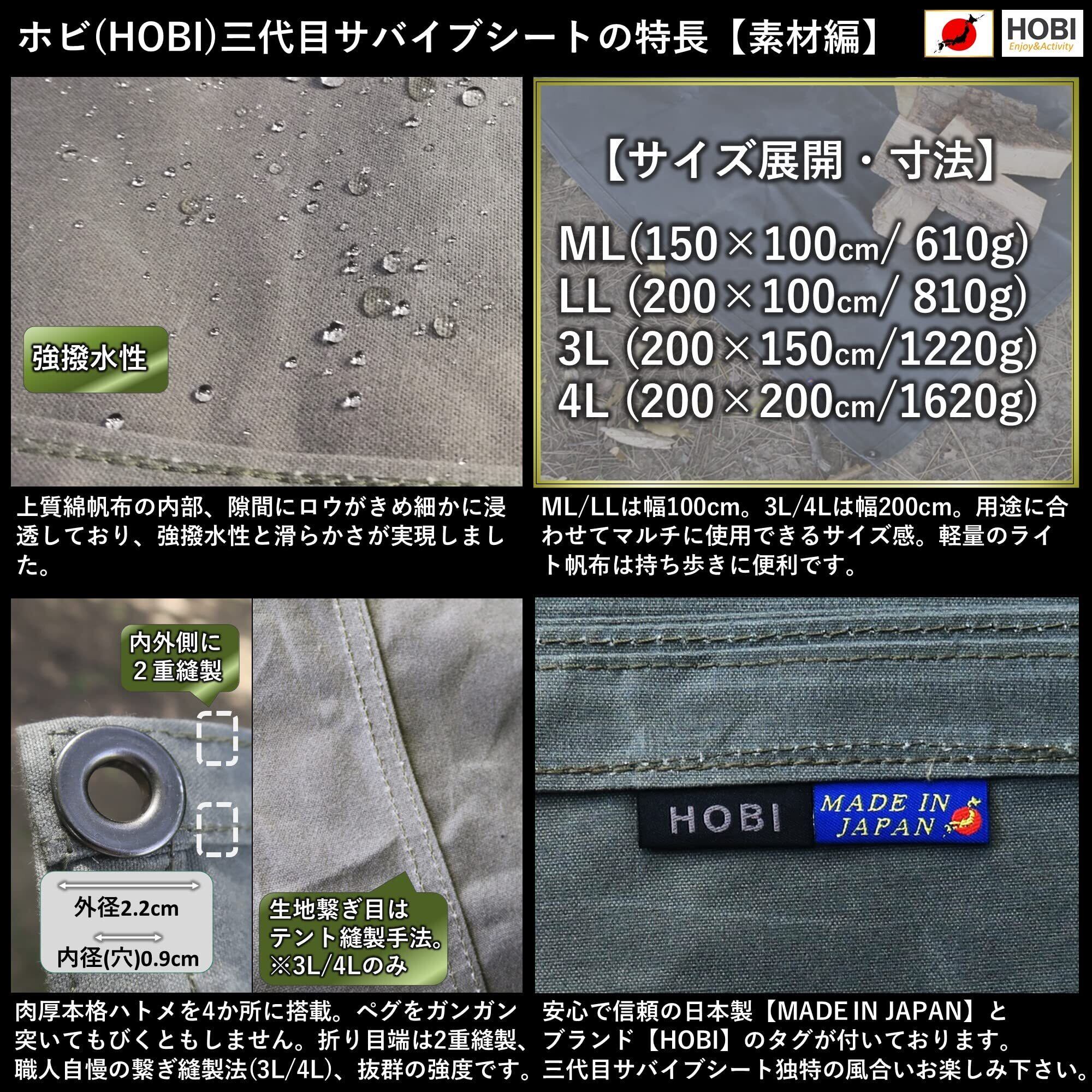 HOBI【日本製】三代目サバイブシートLL(200×100cm) グランドシート 極軽上質帆布 撥水パラフィン加工 [無骨でタフ] 軽量 頑丈ハトメ ブラックオリーブ [MADE IN JAPAN]