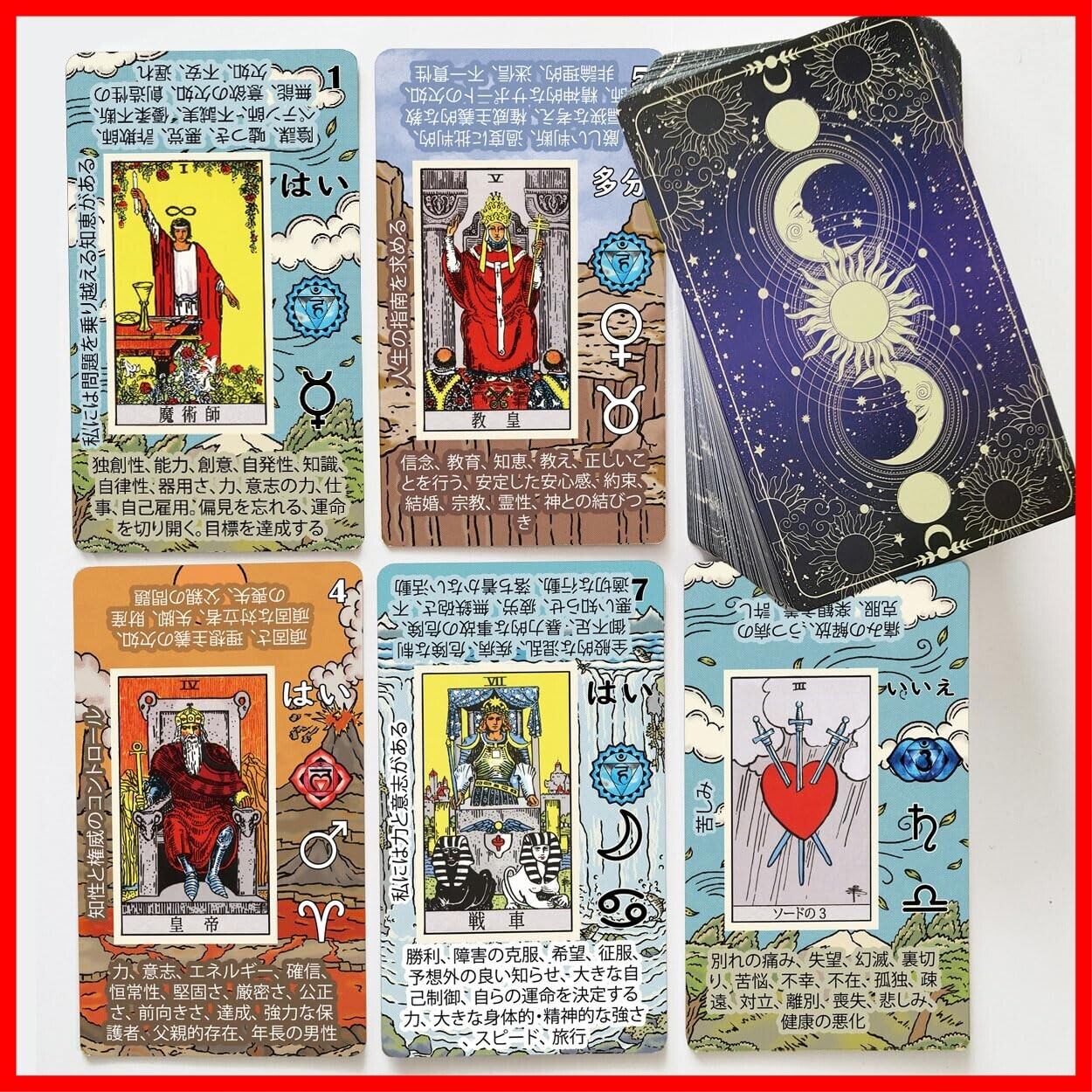 あらゆるレベルの読者に適した汎用性の高いタロットデッキ - アップライトとリバースカードの解説、キーワード、チャクラシンボル、惑星対応、星座関連、エレメンタル対応、そしてリーディングの精度を高めるためのアファメーション付き。