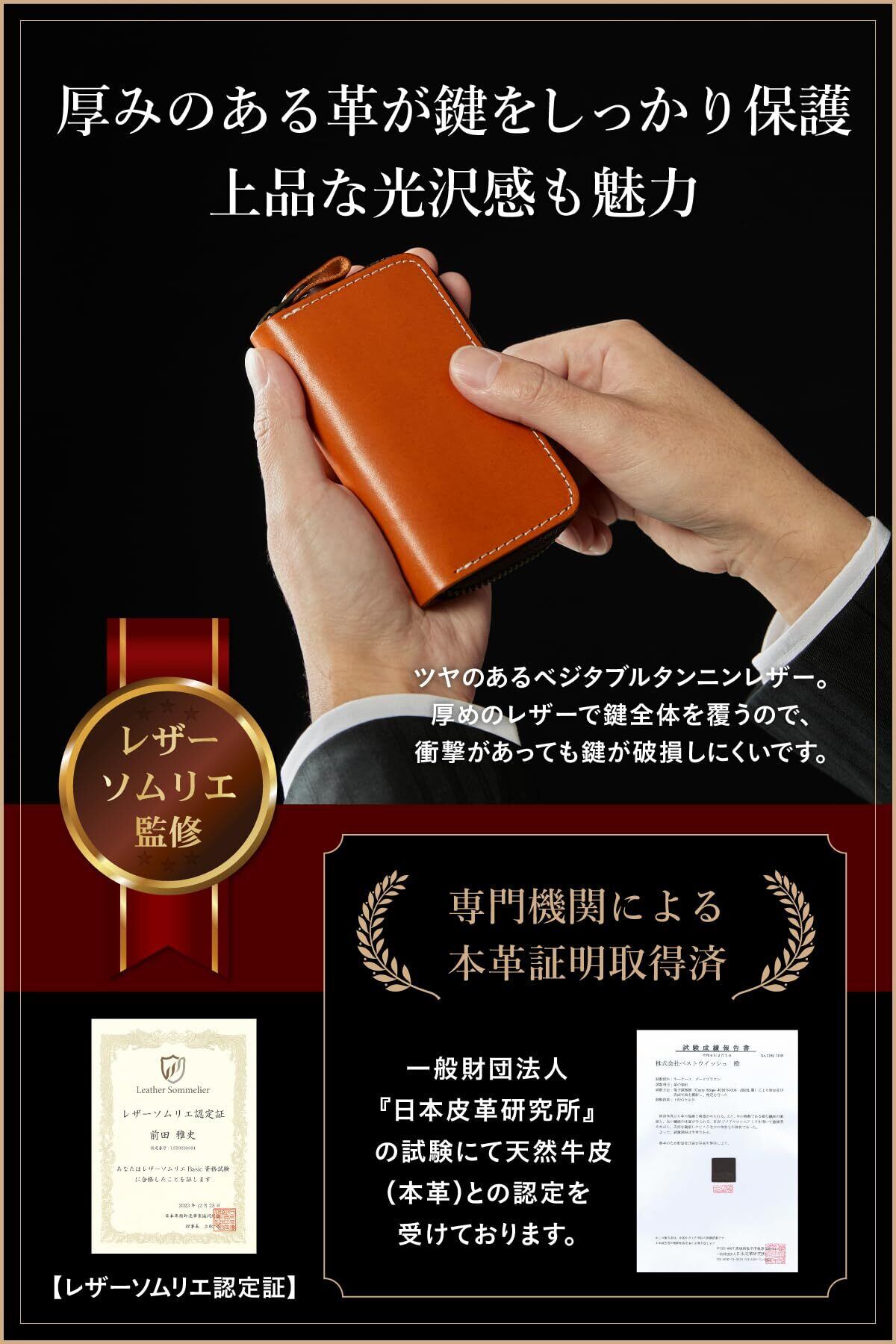 【レザーソムリエ監修/メンズ本革キーケース】長く使い込んでも型崩れしない牛革を使用。厚みのある革で鍵をしっかり保護します。レザーが鍵全体を覆うので、衝撃があっても鍵が破損しにくいです。また、ツヤのあるベジタブルタンニンレザーで、上品な光沢感も魅力!革のエイジングを楽しみながら長くお使いいただけます。
