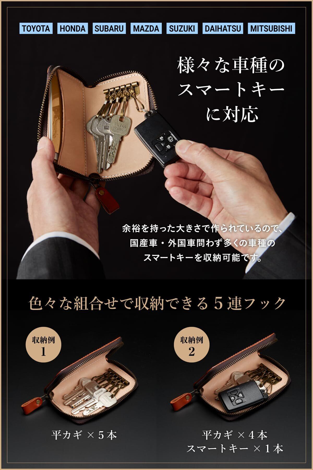 【色々な組合せで収納できる5連フック】『平カギ×5本』『平カギ×4本+スマートキー×1本』など組合せは様々。余裕を持った大きさで作られているので、国産車・外国車問わず多くの車種のスマートキーを収納可能です。