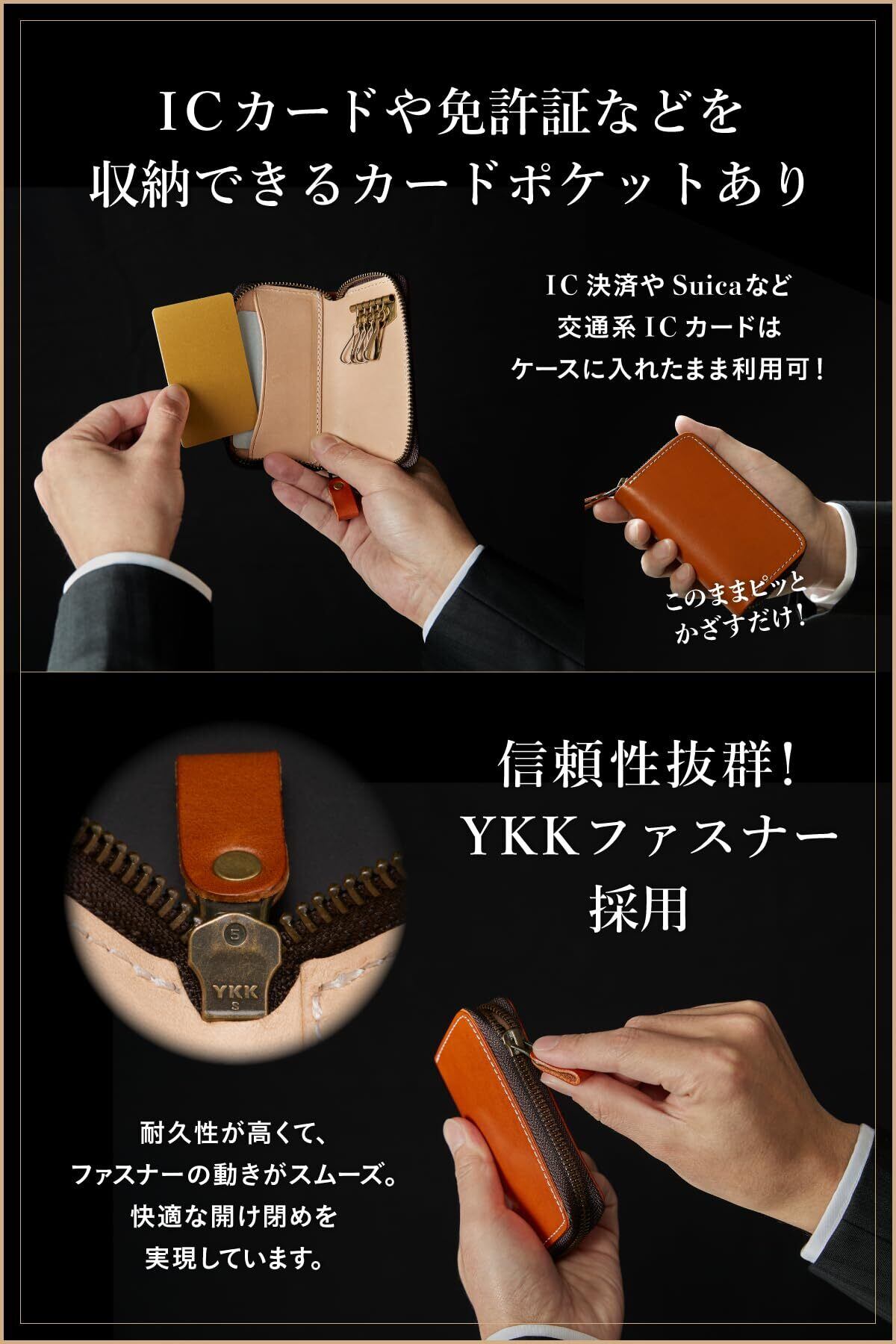 【ICカードや免許証などを収納できるカードポケット】キーケースを開いた左側にカードポケットが1つ付いています。カード2枚程度まで収納可能。IC決済やSuicaなど交通系ICカードはケースに入れたまま利用可能です。