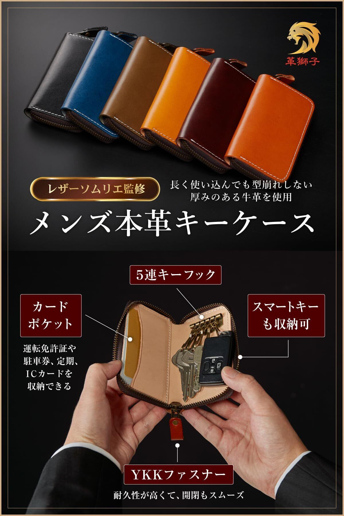 [革獅子] キーケース メンズ スマートキーケース 本革 鍵 ケース 【レザー ソムリエ監修】 YKKファスナー 5連 カード収納