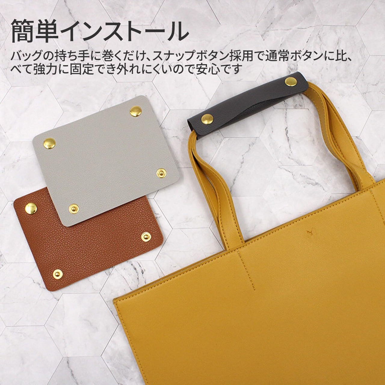 【取り付け簡単】バッグのハンドルに巻きつけるだけ。スナップファスナーで固定します。通常のスナップファスナーよりも強力で、簡単に外れないのでとても安全です。