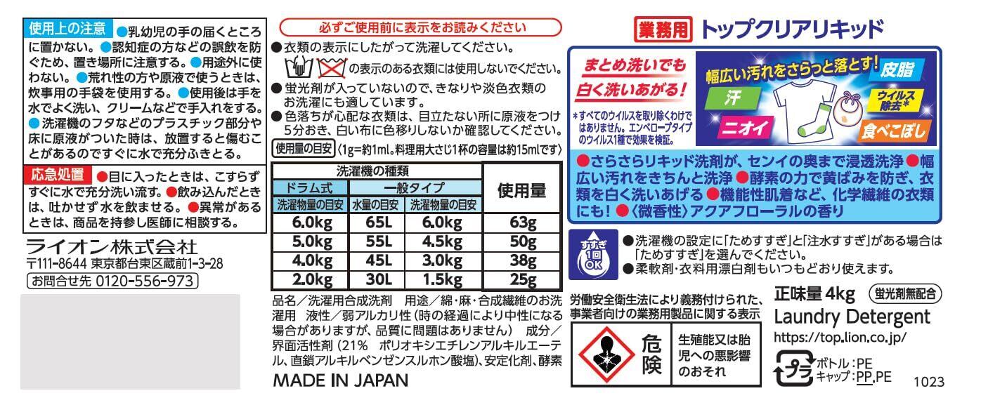 【業務用 大容量】 トップ クリアリキッド 4㎏ 洗濯洗剤 詰め替え 蛍光剤無配合 液体