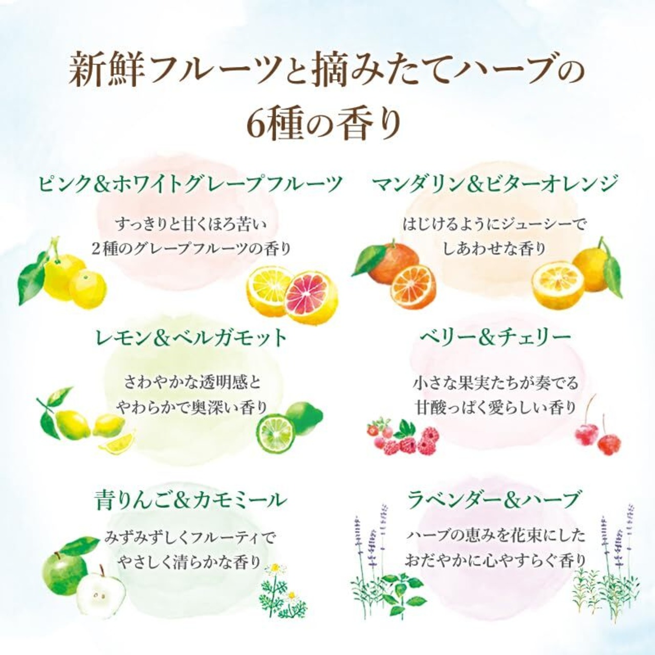 「アロマルセット」Aroma(香り)+Rucette(レシピ)フルーツやハーブ香りをブレンドしたフレッシュでみずみずしい香りのシリーズです。