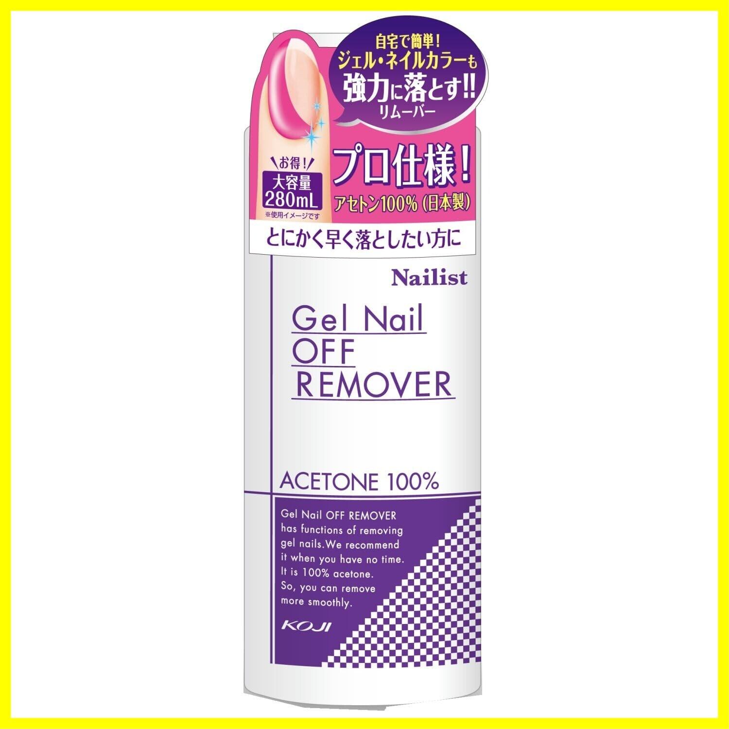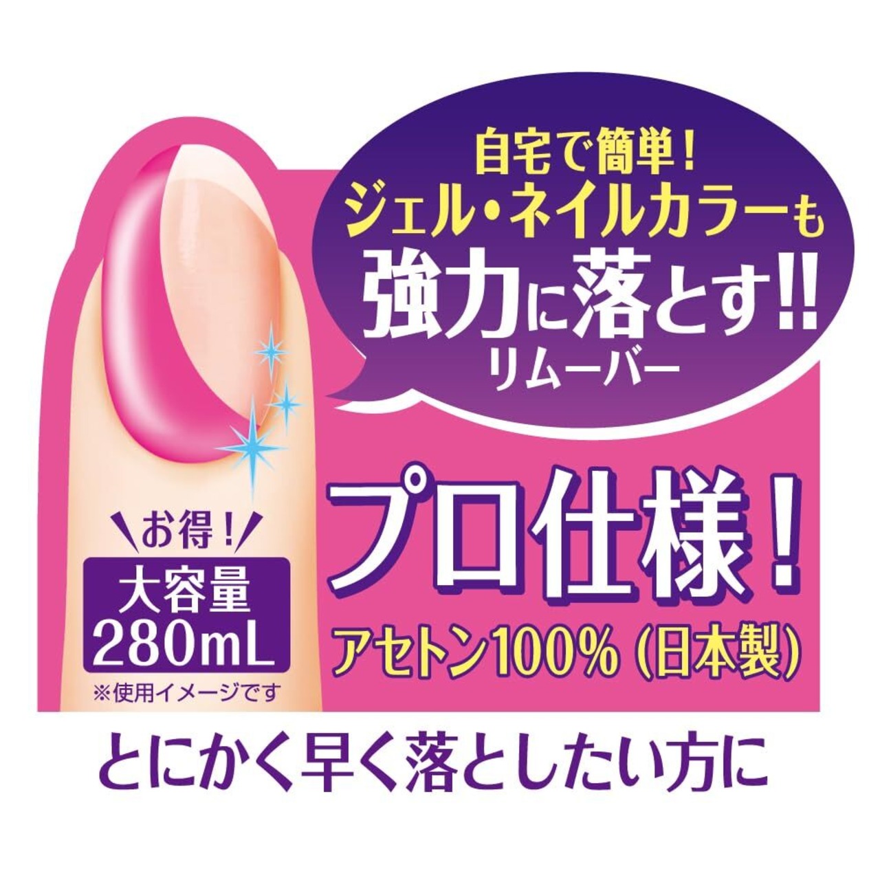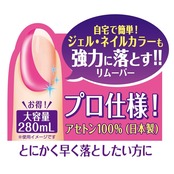 とにかく早くジェル・ネイルカラーを落としたい方向けのジェルネイルオフリムーバー。プロ仕様の、強力 アセトン100%でしっかり落とせる。大容量280ml、日本製、無香料・無着色。