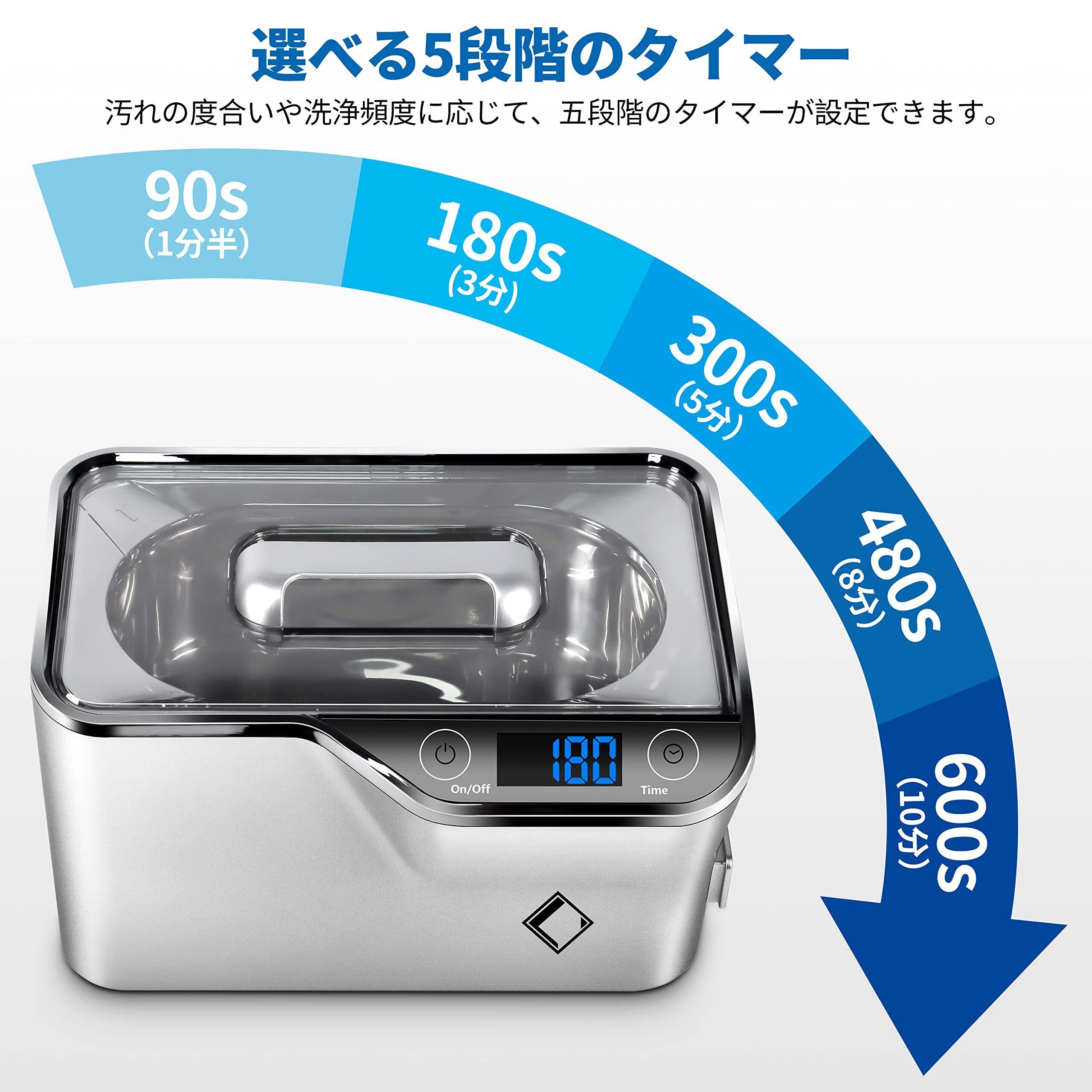 ✨【操作簡単・5段階タイマー制御】超音波を水に発生させて、腕時計、メガネ 、アクセサリー等の微細な隙間に溜まっている汚れを取り除く超音波洗浄機です。5段階のタイマー機能(180、280、380、480、90秒)が搭載されています。汚れの度合いや洗浄頻度応じてタイマーが設定できます。洗浄中、タイマーはカウントダウン表示で、残りの洗浄時間がひと目で分かります。