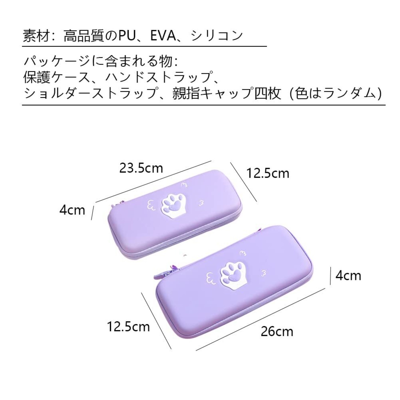 猫肉球型のNintendo Switch専用の保護ケース、素材:高品質のPU、EVA、シリコン、安全、高品質の素材を選びます。パッケージに含まれる物:保護ケース、ハンドストラップ、ショルダーストラップ、親指キャップ2枚(色はランダム)。スタイル:Switch専用・パープル。サイズ:26*12.5*4CM。ケース重さ:192g。