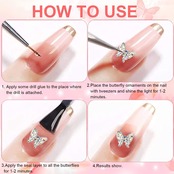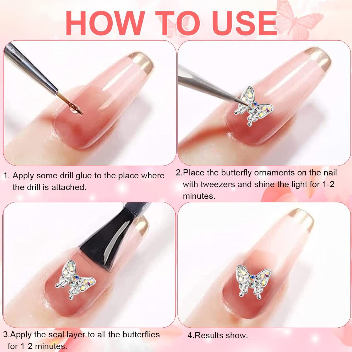 【使いやすい】天然または人造の爪にマニキュアを塗り、好きな蝶型のアクセサリーを選んで爪にのせ、紫外線ランプで硬化させます。さらにゼラチンを塗る。完璧な爪飾りができあがります。