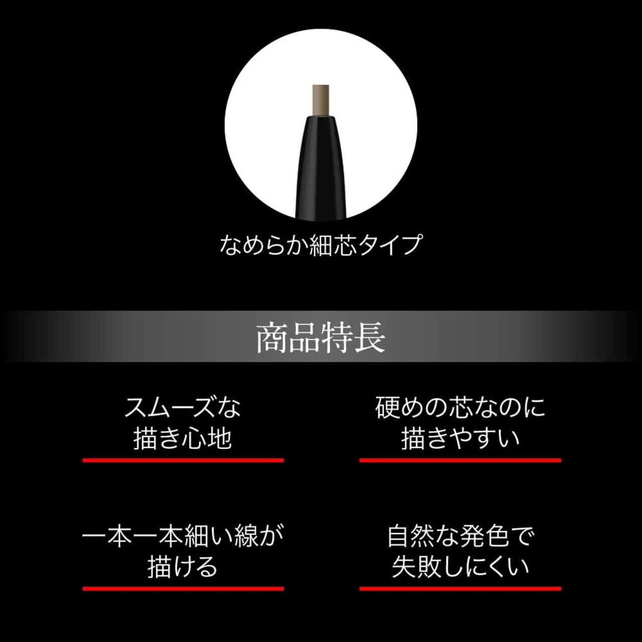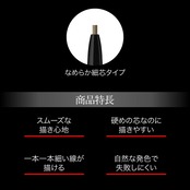 1本1本、まるで自眉のような毛流れ眉に狙い描きできるアイブロウペンシル ■スムースタッチ成分※配合:均一でスムースな描き心地を実現 ※リンゴ酸ジイソステアリル、トリ(カプリル酸/カプリン酸/ミリスチン酸/ステアリン酸)グリセリル、水添ココグリセリル ■硬めの芯なのに描きやすい:体温に近い融点を持つ固形ワックスを配合。芯先が肌に触れると摩擦熱により、なめらかなタッチに変化し、描く時に硬さを感じにくい