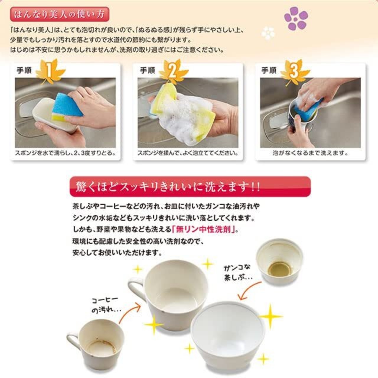 汚れ落ちはもちろん!ぬるぬる感が手に残らない独自の成分配合でお肌にも優しいつくりに。また、少量で泡立つから長持ちで環境にも配慮されています。