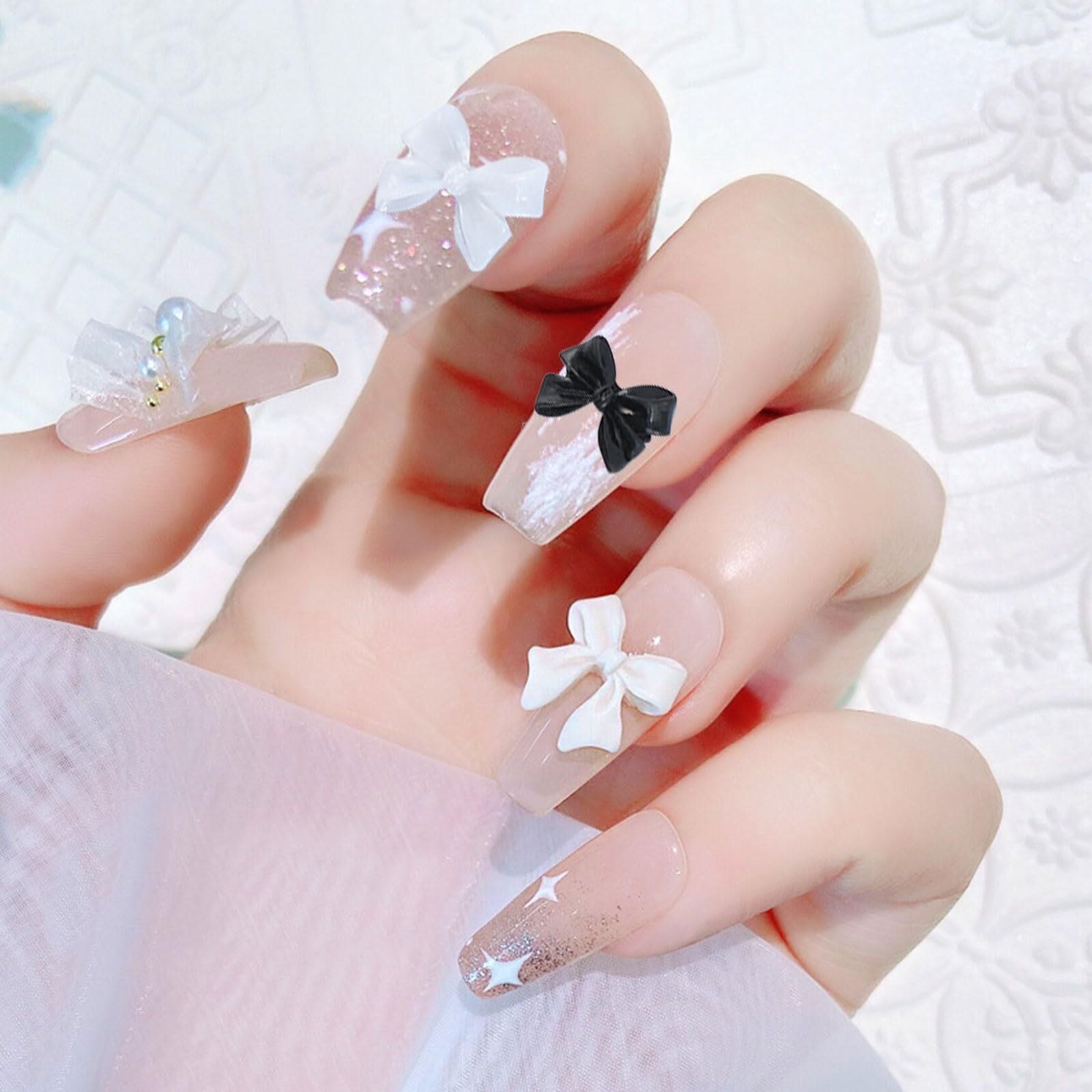 立体感がある黒と白なリボンパーツです。ネイルのワンポイントに最適です。大きめな蝶結びなので、存在感があり、ネイルを可愛らしく飾ります。