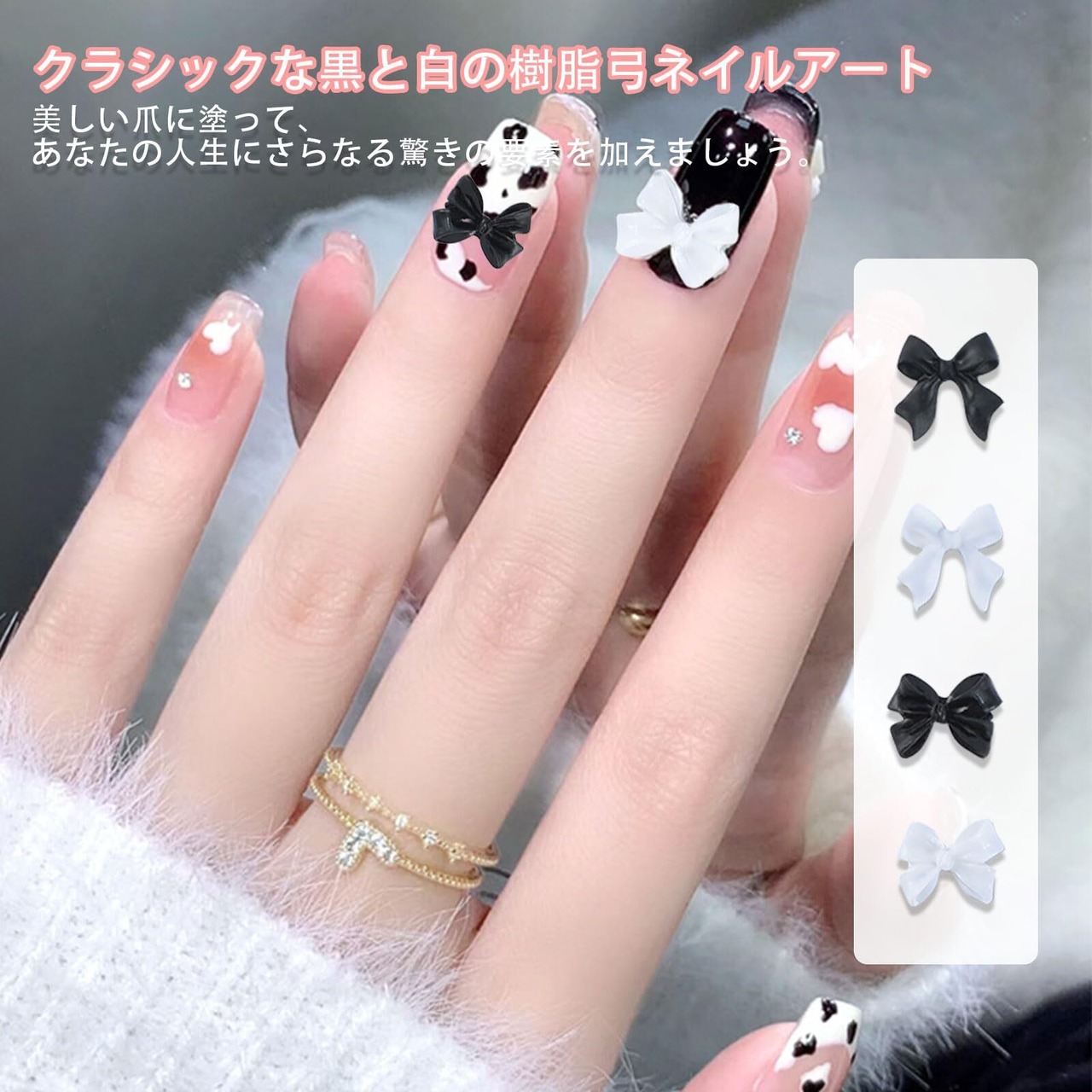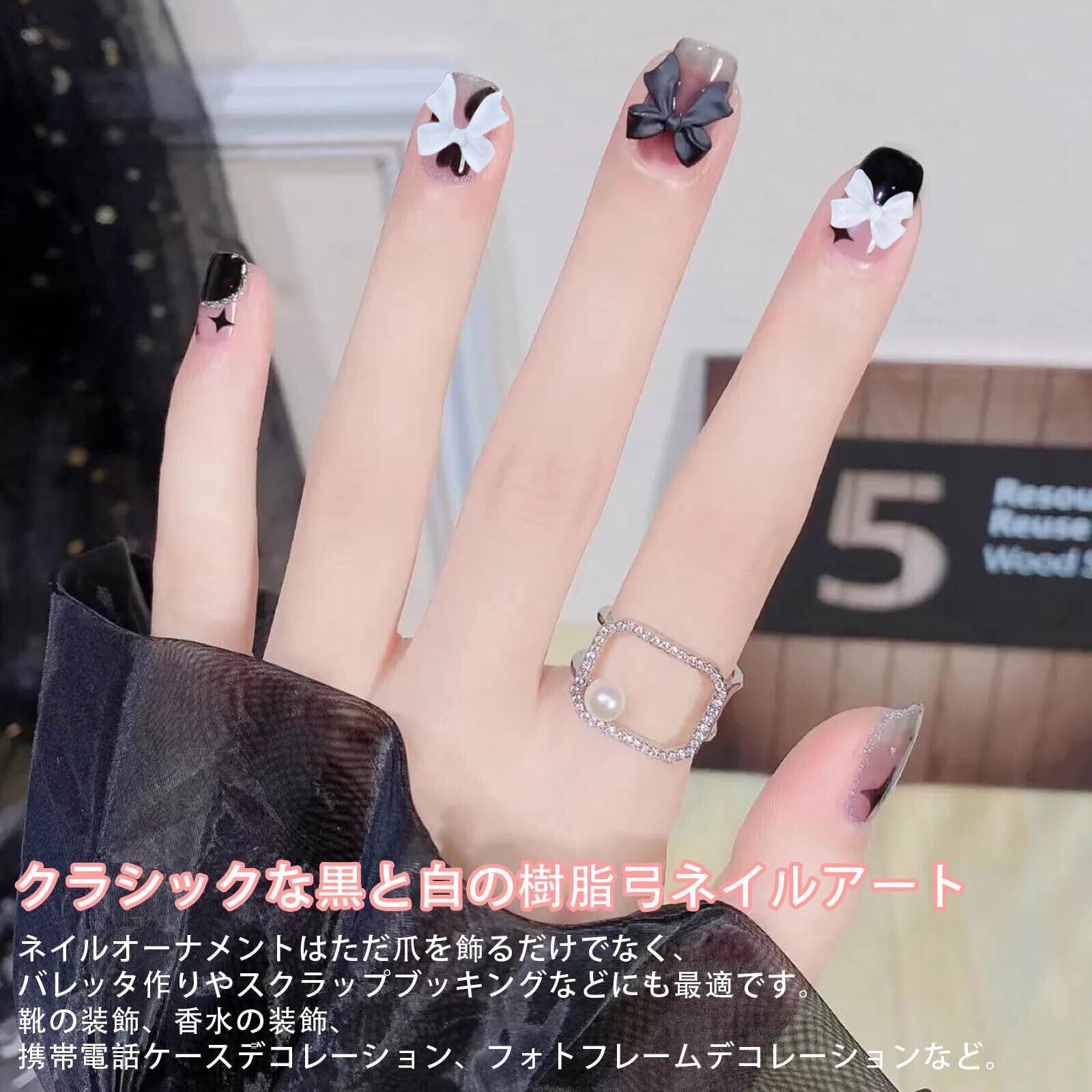 材質:合成樹脂 サイズ:リボン蝶結びパーツ:10mm*10mm。短い蝶結びパーツ:8mm*10.5mm。 立体感がある黒と白なリボンパーツです。ネイルのワンポイントに最適です。大きめな蝶結びなので、存在感があり、ネイルを可愛らしく飾ります。 ほかのネイルパーツと組み合わせて使っても単品使いも可能です。カラーのバリエーションが豊富で、様々なネイルが作れます。ネイルのデコはもちろん、小物やクラフトのデコパーツ、手芸用品としてもご利用いただけます。 パッケージ:リボンパーツ約200個入り。