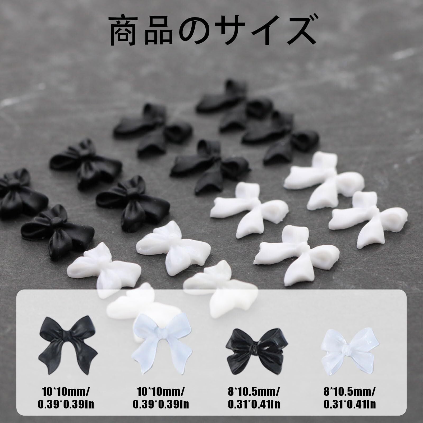 サイズ:リボン蝶結びパーツ:10mm*10mm。短い蝶結びパーツ:8mm*10.5mm。