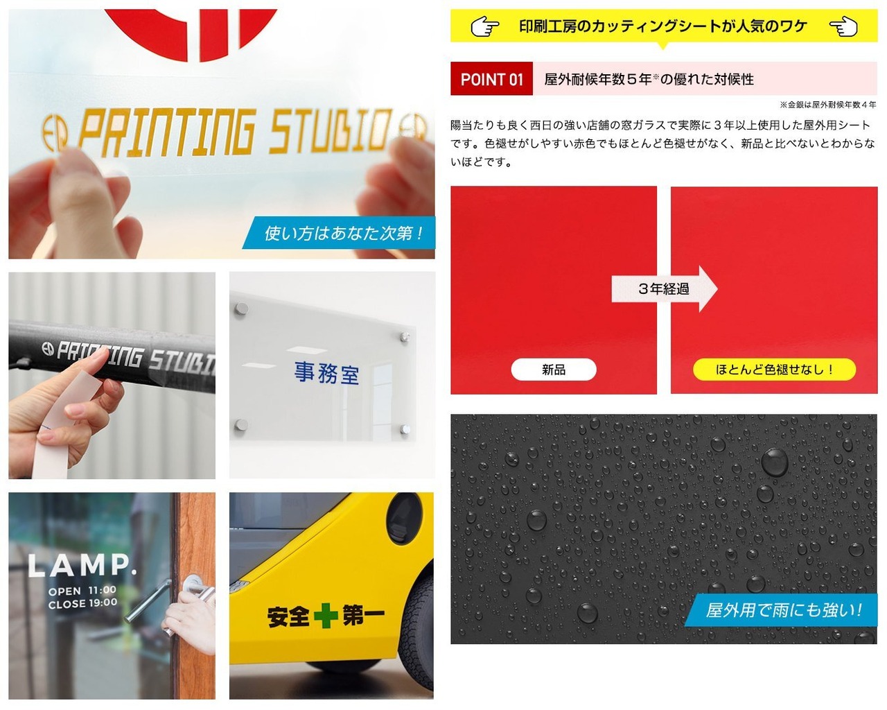 ステッカーや看板の作成に適しており、車の外装などにもおすすめです。