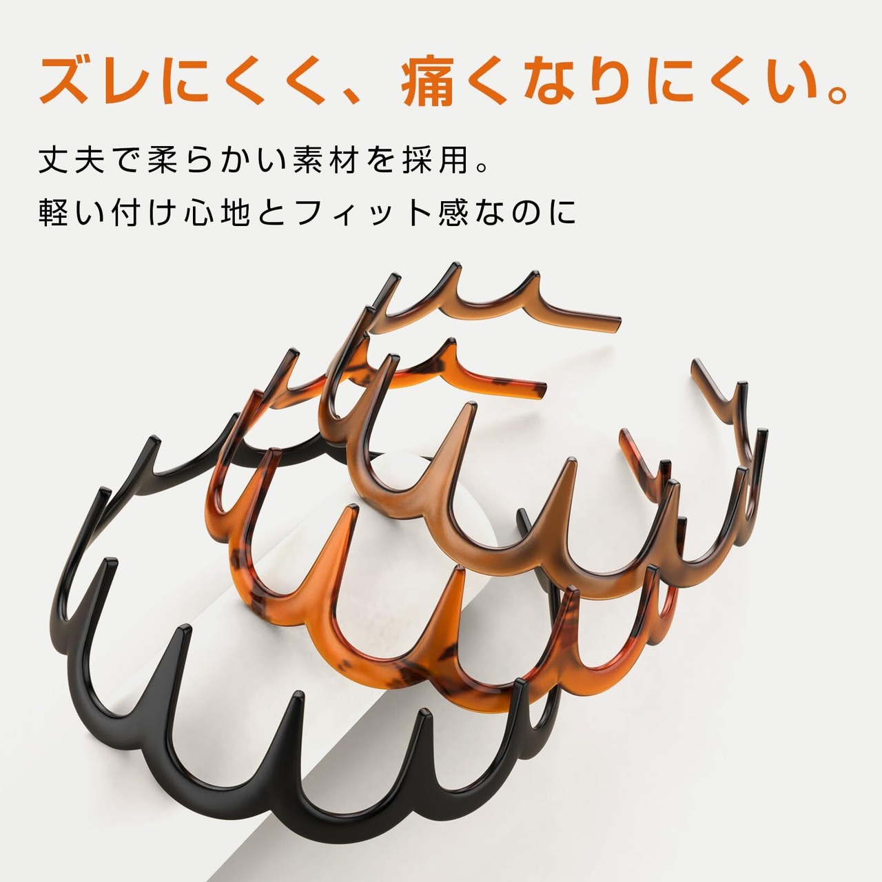 【丈夫なカチューシャ】PC材質でできている、それは丈夫で、伸びるのが自由で、壊れるのが容易ではありません.。「カラー」べっ甲 ●「素材」PC材質。