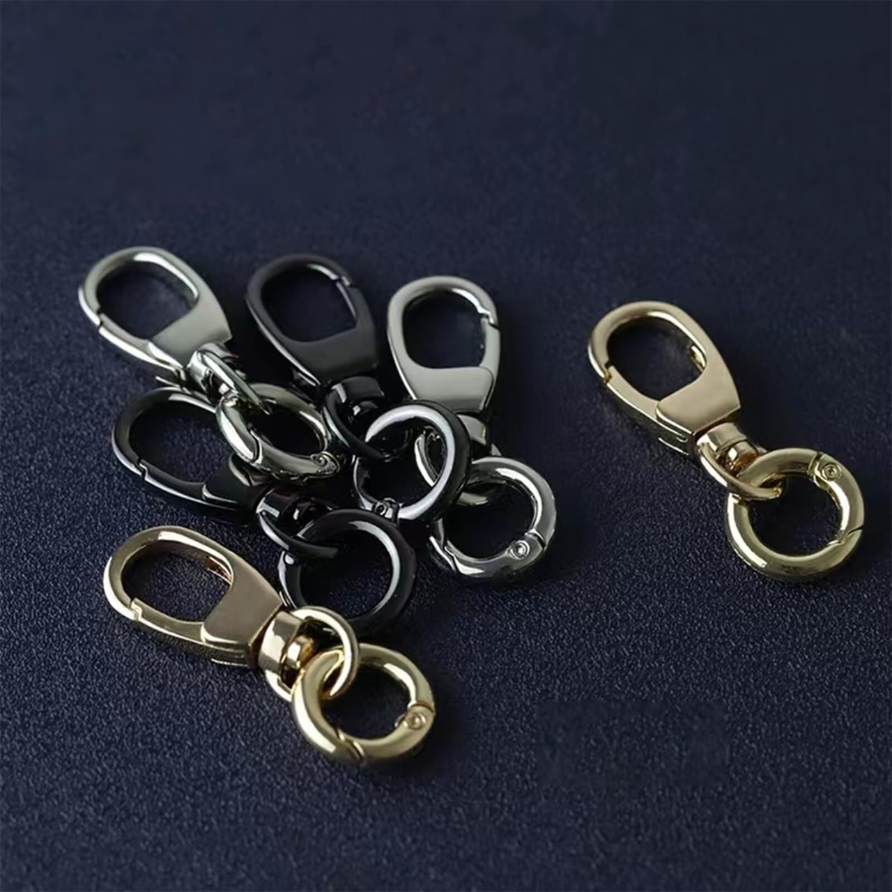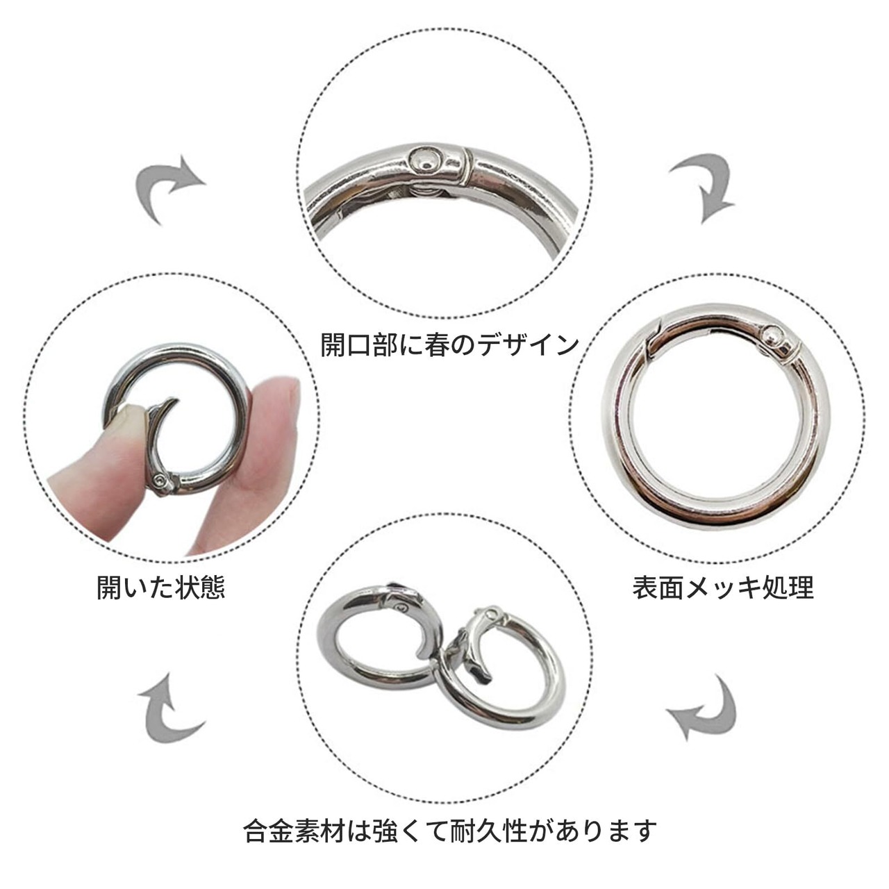 【ワンタッチ開閉】キーリングは、開閉は片手でも簡単に出来る丸い形状のスプリングフックです。アイテムを吊るす時に強めのバネでしっかり閉じます、変形しにくく、耐久性があり再利用可能です。