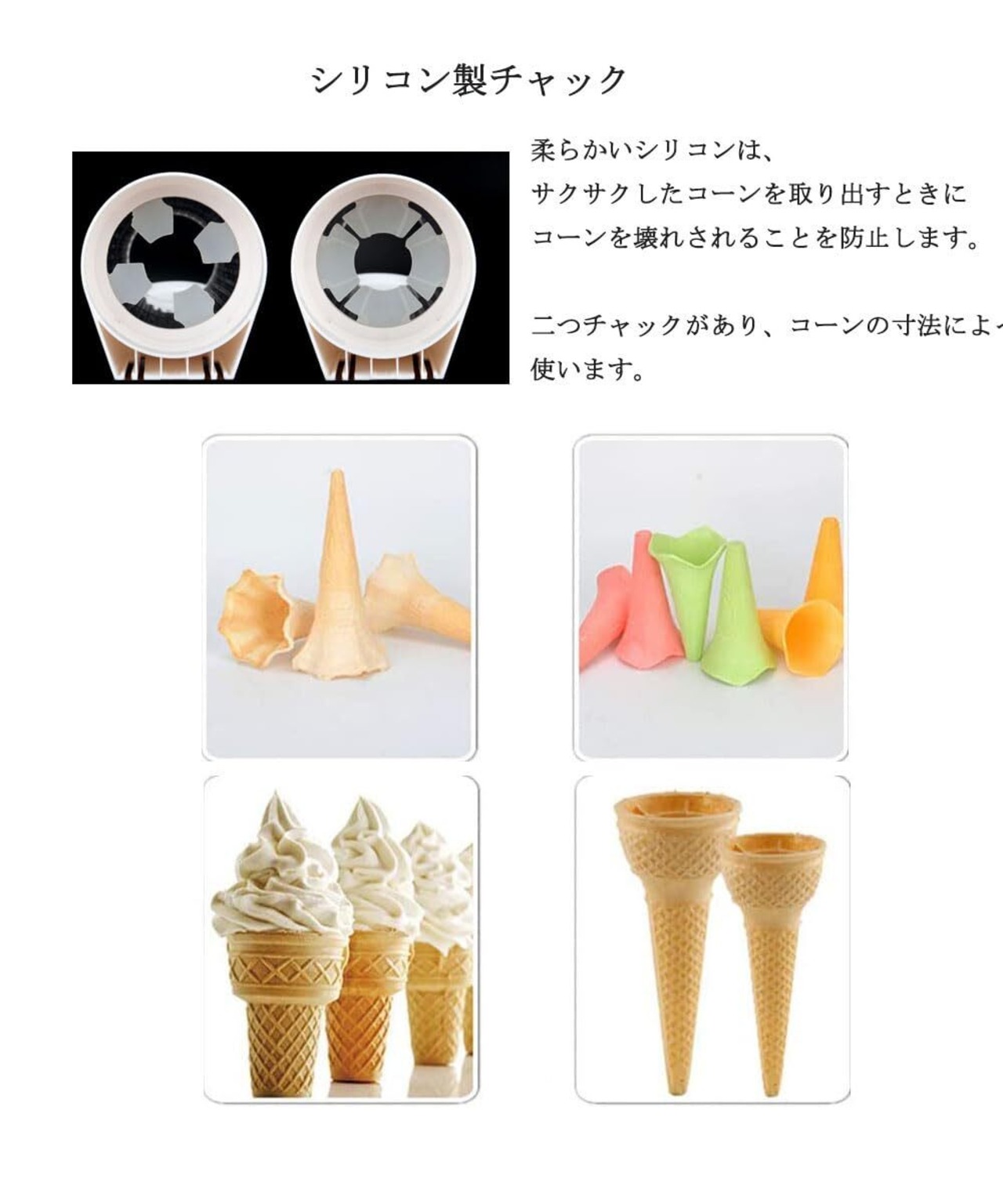 対応のコーンのサイズ~入口の直径40~76㎜のコーンカップを対応します。二つチャックがあり、使うコーンのサイズによって使います。