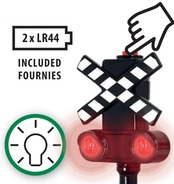 踏切シグナルのボタンを押せば赤いランプが点滅し、列車が安全に通過できます。