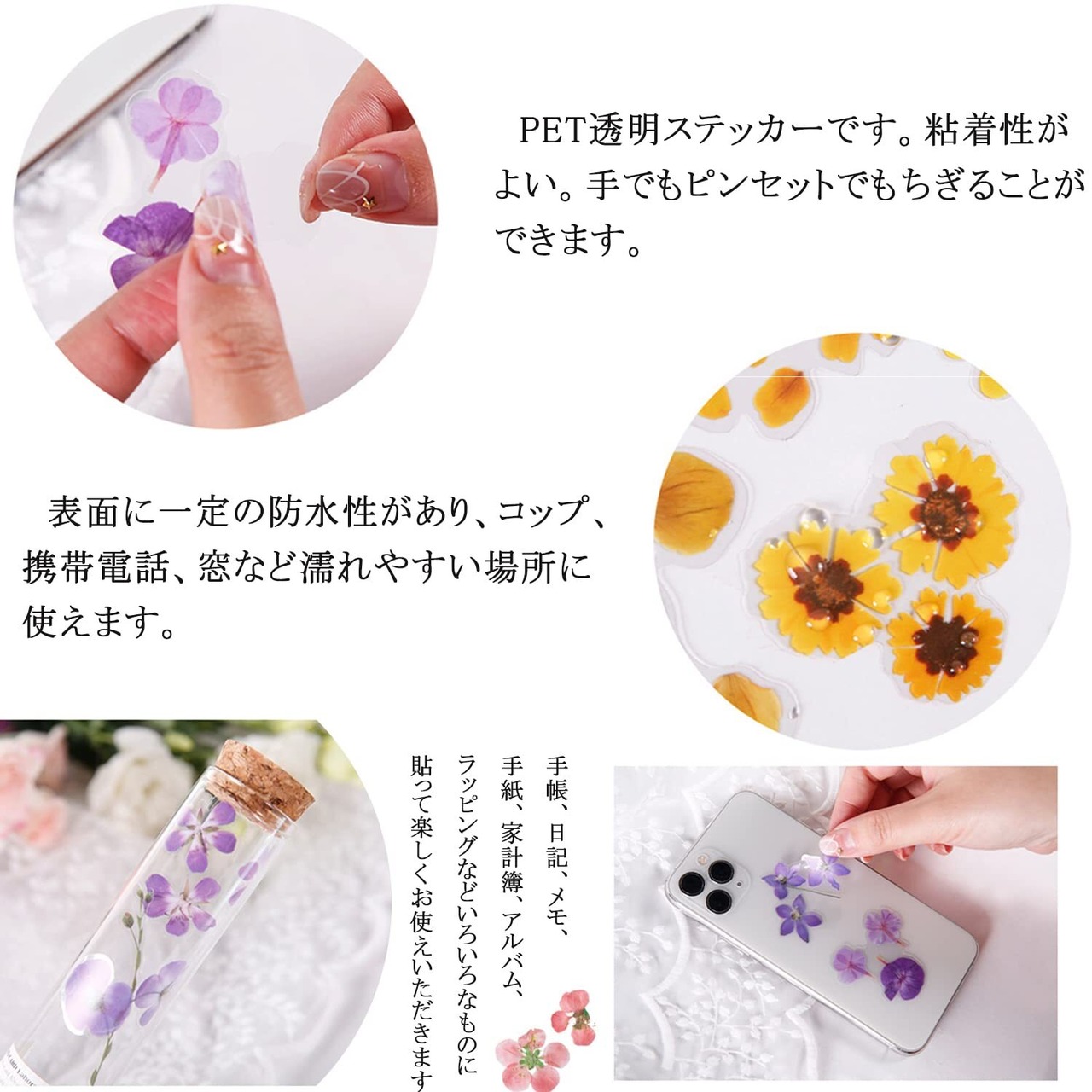 「素材」上品質のPET素材です。貼り付けることができて、花の絵柄の印刷がはっきりしていて、花びらも見ることができます。楽しい飾り付けができます。
