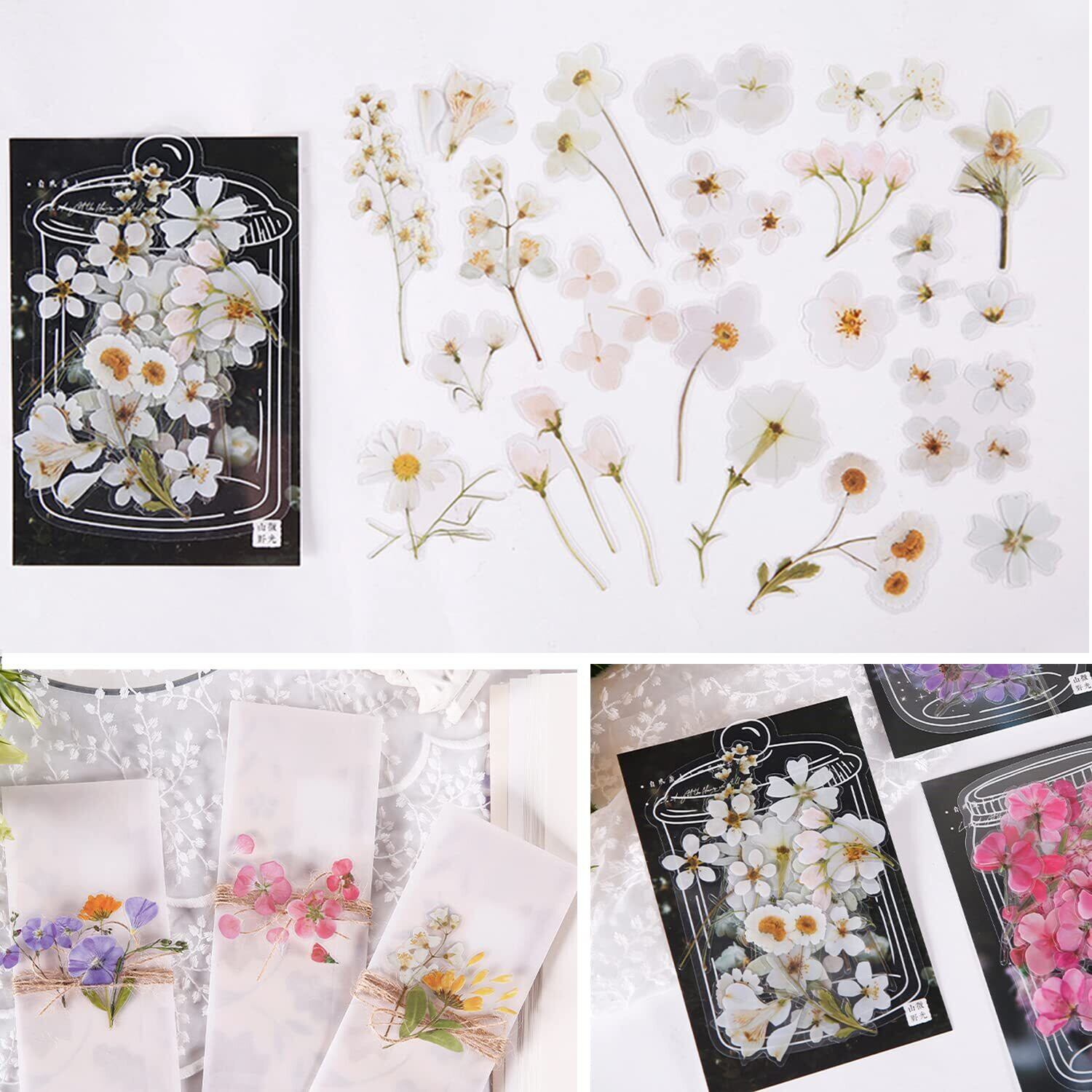 「164枚の大容量」ガラス瓶シールのサイズは約7.5センチ×13センチです。合計4種類、4枚があります。花シールの長さは3 ~ 6センチほどです。4袋入りで、1袋に20種類の花があり、合計160枚の大容量!