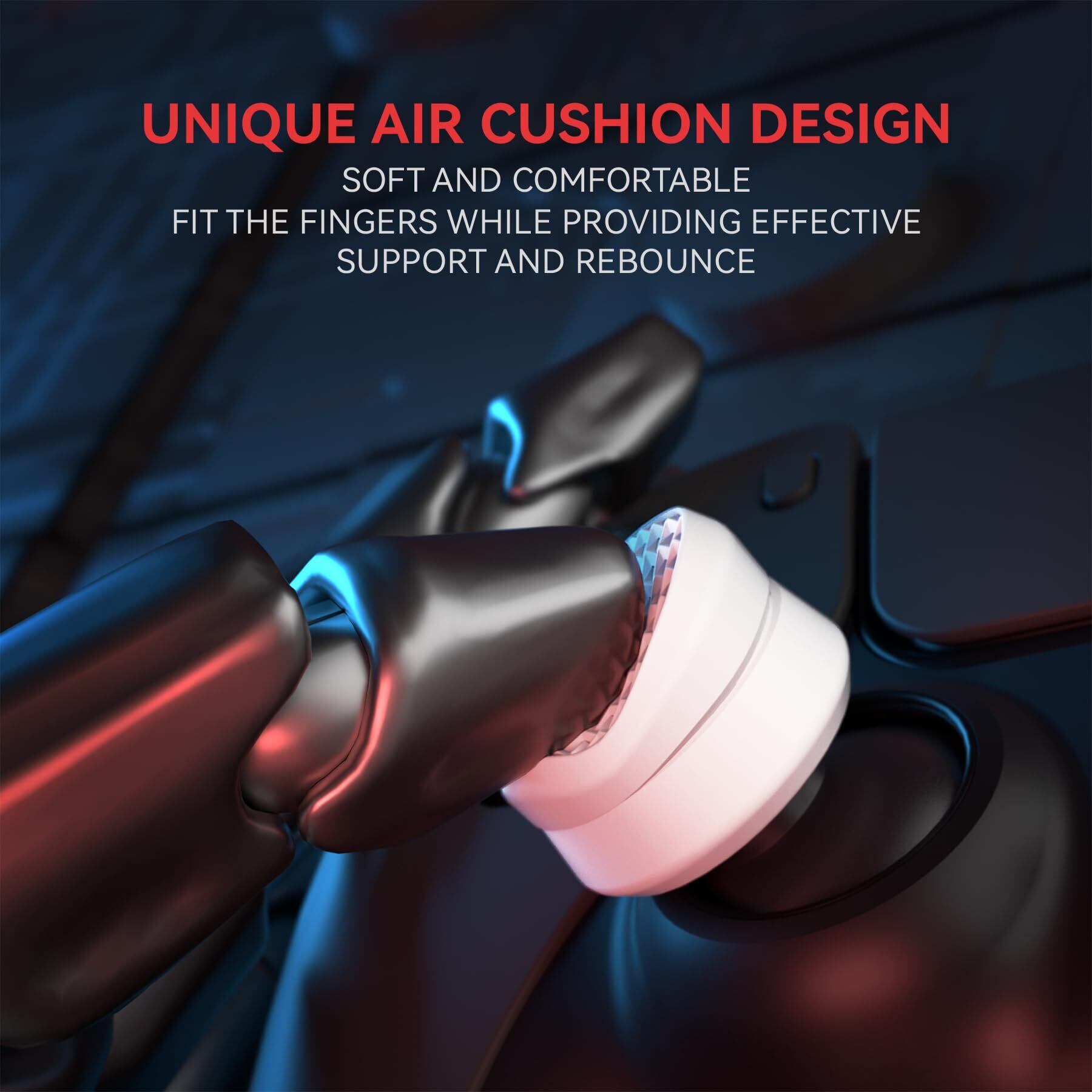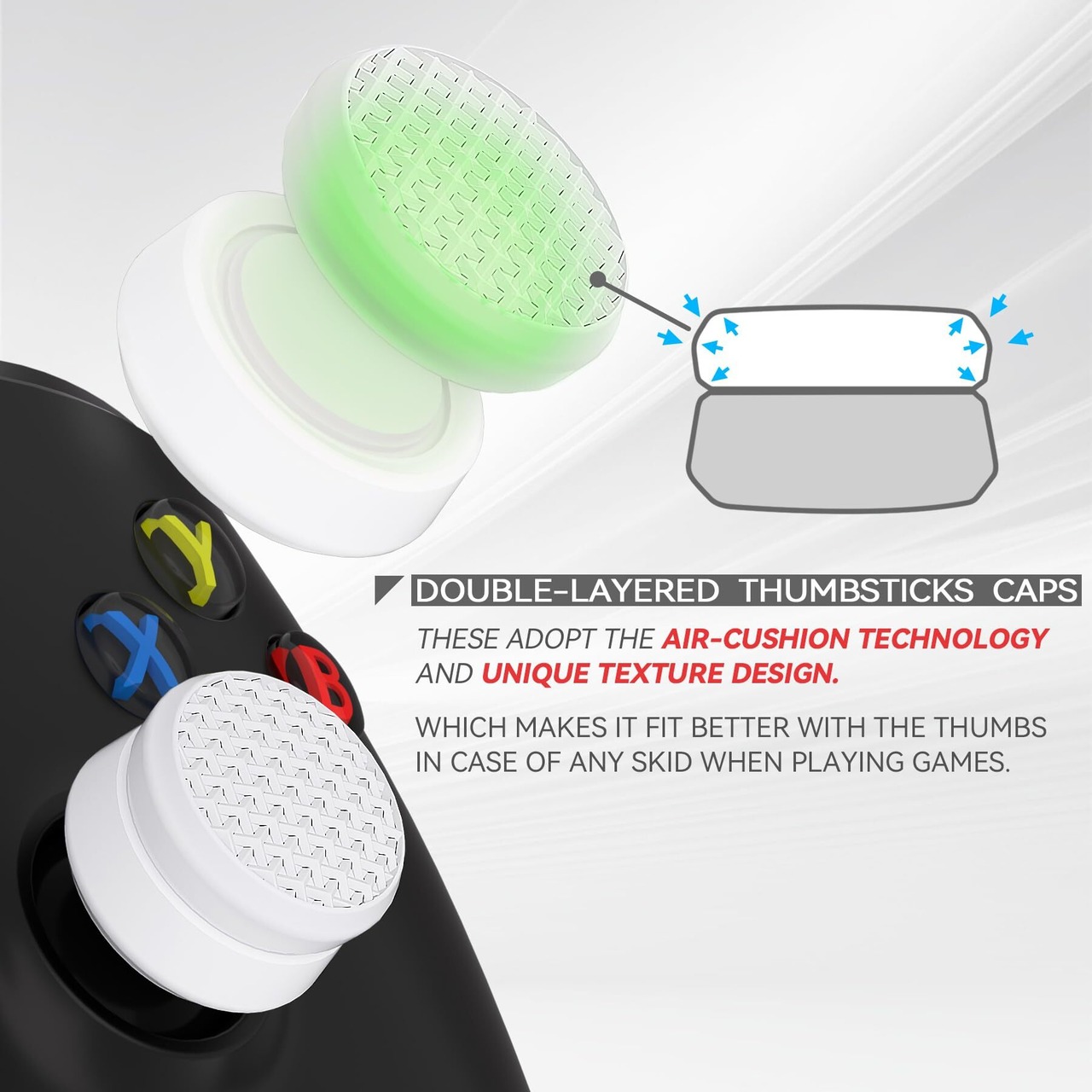 独自のエアクッション技術を利用した二層式アナログスティックキャップは、ゲーマーにより快適なグリップを提供し、手や親指への負担を軽減します。