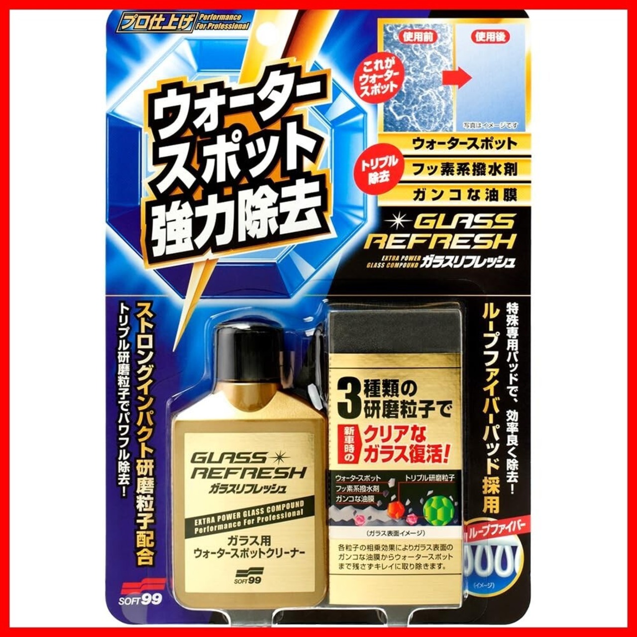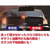 ●新開発のトリプル研磨粒子が、これまでのガラス用コンパウンドでは落とせなかったウロコ状のシミを強力に除去します。●ガラス表面の汚れ・油膜・ガラスコーティング剤・ウォータースポットの除去。